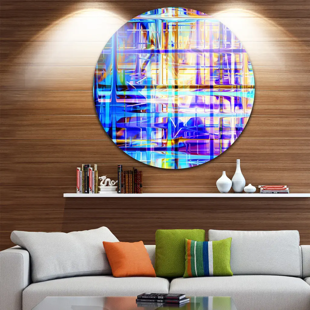 Bring Contemporary Abstraction to your home with this large Circle Metal wall art. This Blue Abstract Grid Metal Artwork makes it the focal point of any room or office. - White Gloss Coating ensures colors are extra vibrant with light reflection.- Aluminum grade Sheet Metal with 1 inch mounting frame on the back giving the illusion that the artwork is floating on the wall..- Mounting Brackets are included along with instructions.- High Quality Digital images are created directly into a glossy aluminum panel producing a stunning and captivating print into the glossy finish of the metal.- Water, Fire and Scratch resistant HD Aluminum panels.- Looks better than any photo paper and guaranteed to last at least 20 years- Easy to clean with a microfiber cloth. Colors are far superior to regular Canvas Art. - Easy to Hang