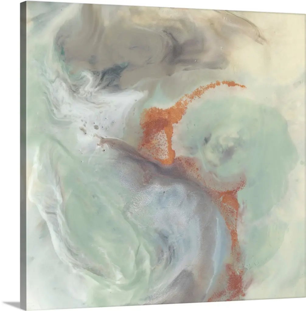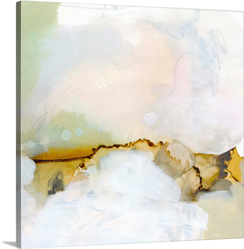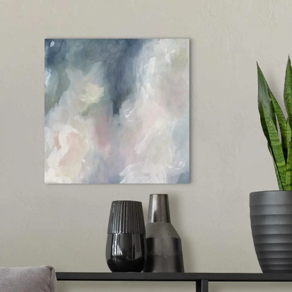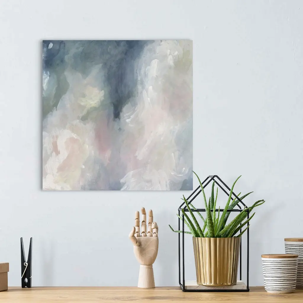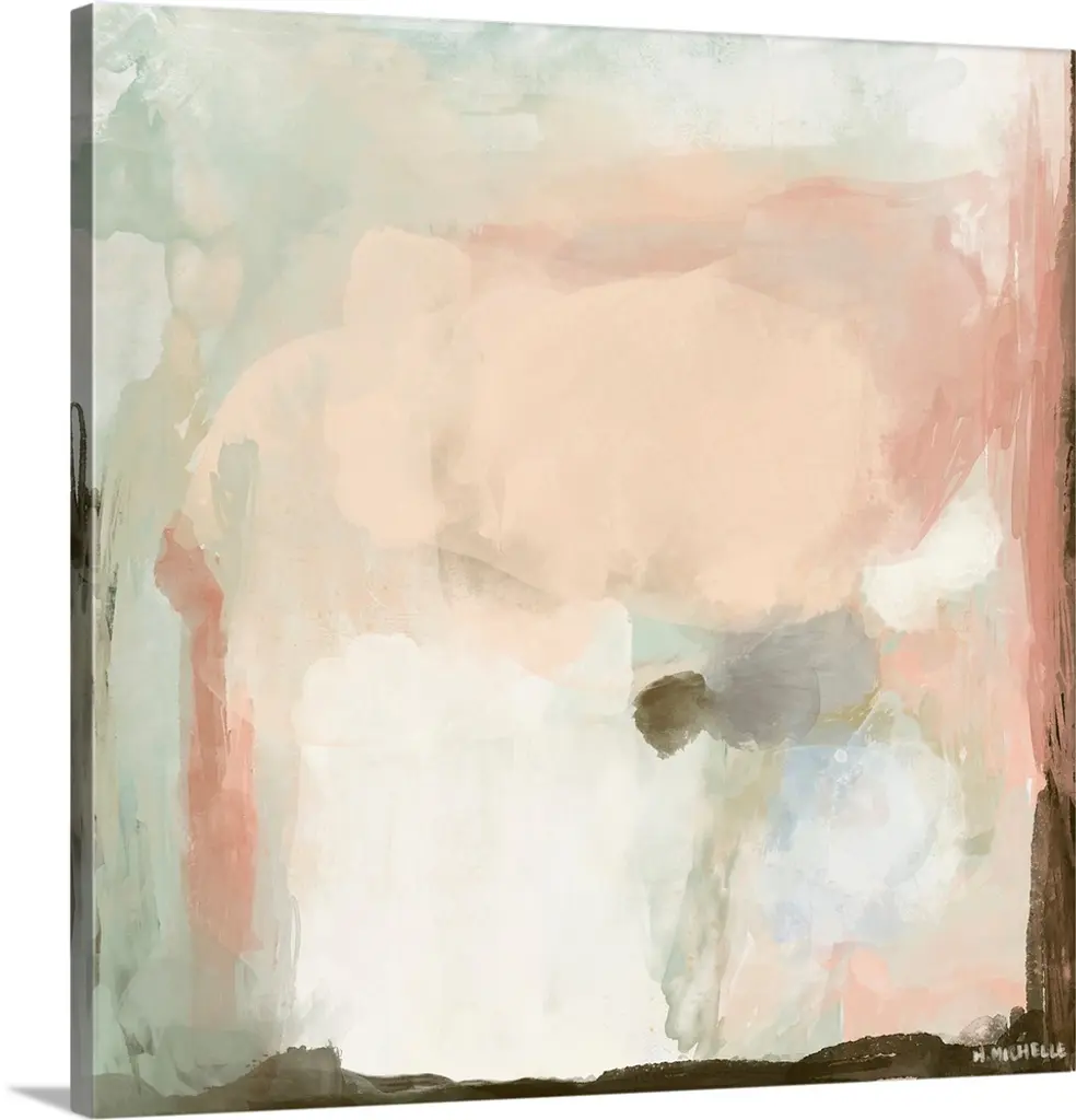 A modern abstract painting of blended pastel tones of pink, blue and white making circular shapes.