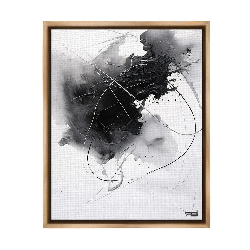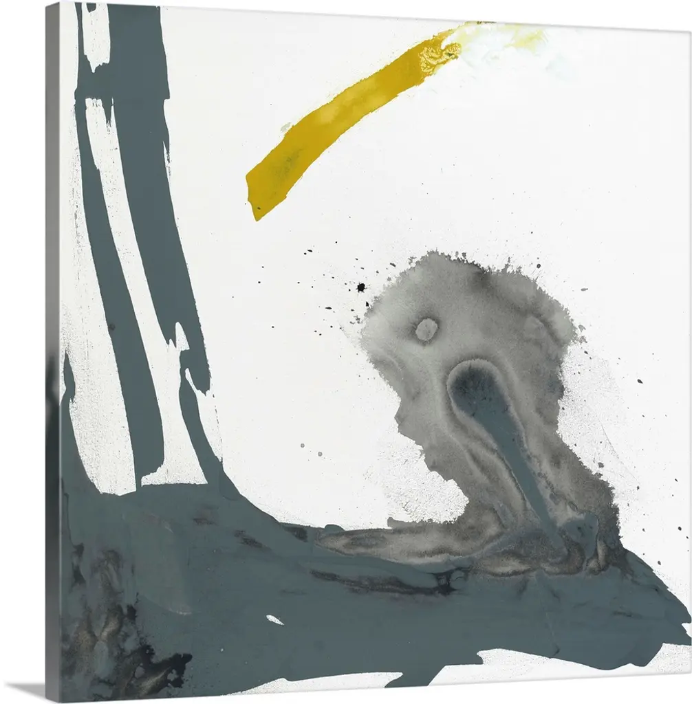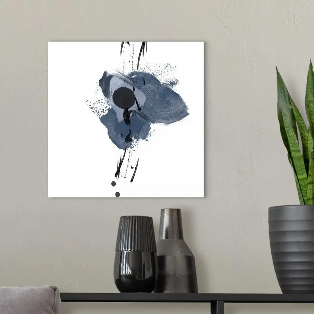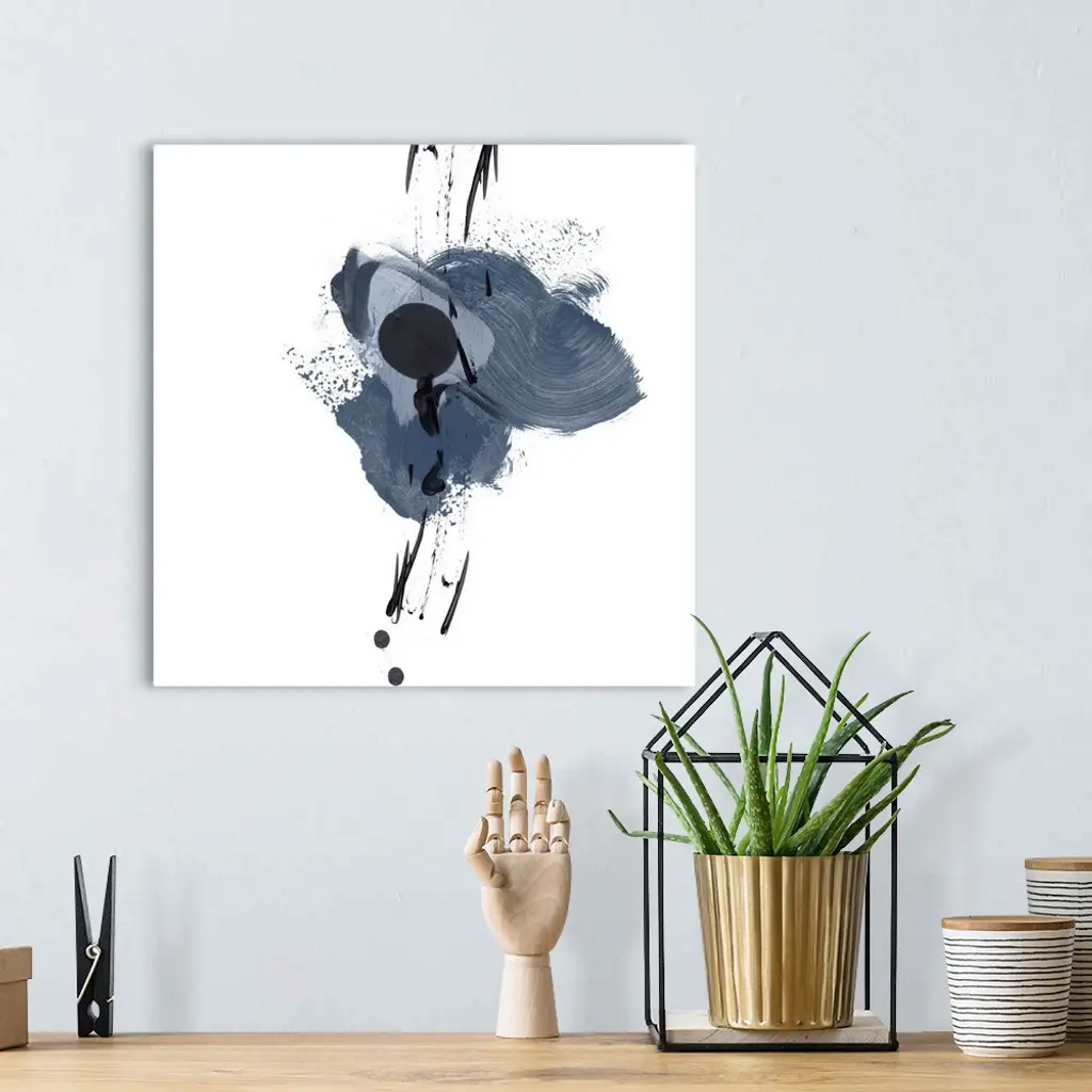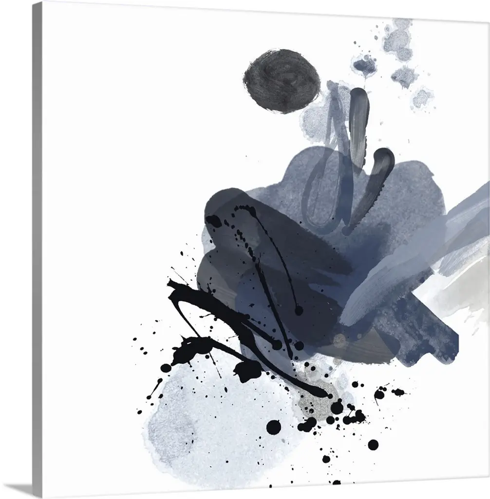 This expressive abstract painting features black paint splatters over broad brush strokes in shades of blue against a white background.