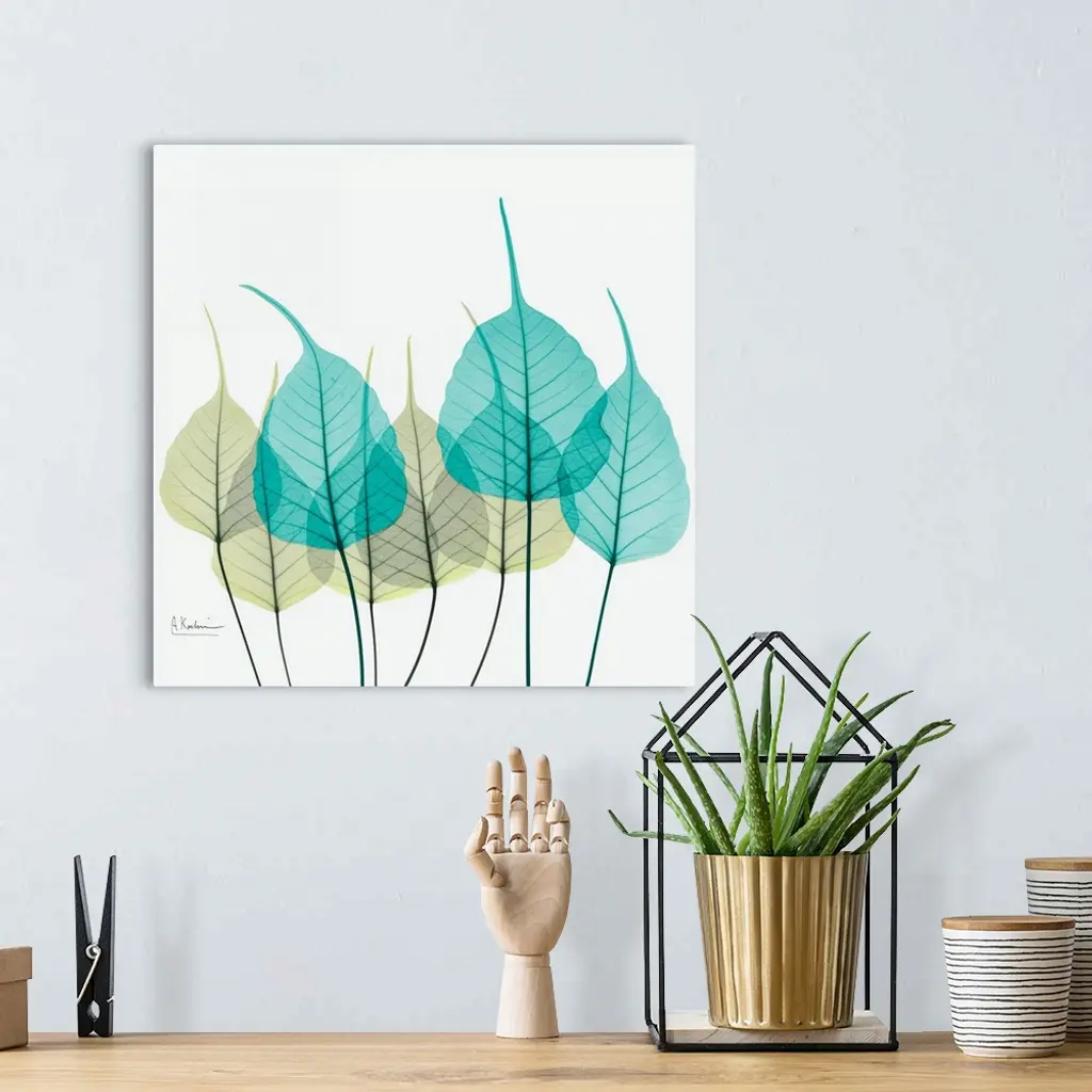 Giant, square fine art, X-ray photograph of a group of leaves in blues and greens on a solid white background.