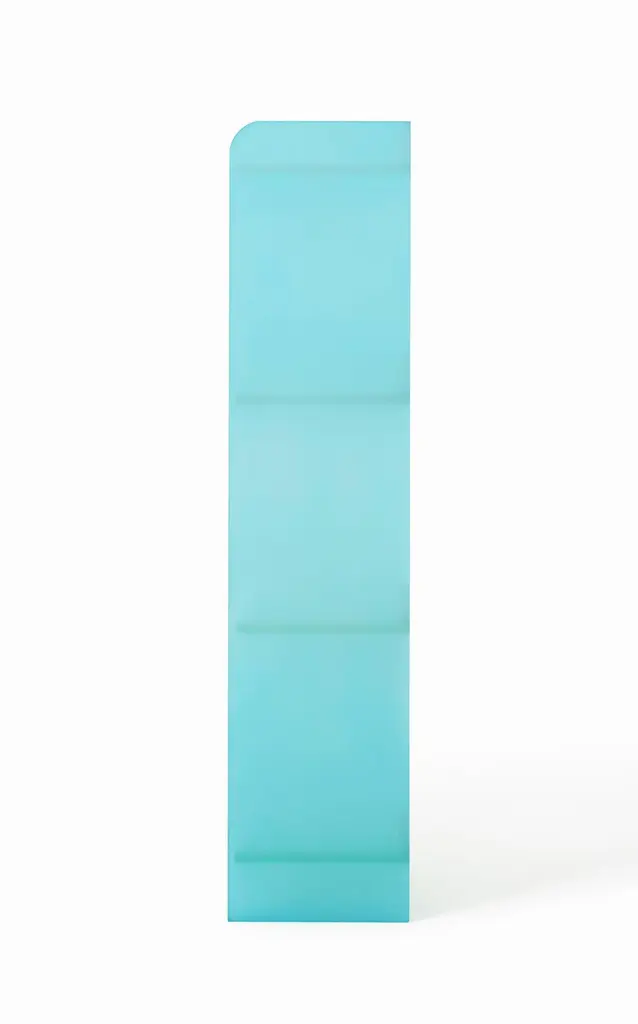 The tone shelf is inspired by the traditional colors of Korea, especially "Hanbok," which is a traditional Korean dress for formal occasions. Here, those traditional colors are made into art furniture with a modern sensibility, in Korean jade and sky blue. The tone of the blue gives an elegant and dreamy vibe.As artisans dye each piece of acrylic by hand, the tone in this piece is completely different from that of a mass-produced product, and as such, has its own value as a limited artwork. Wide spaces between the shelves can fit large books, vases, or props.