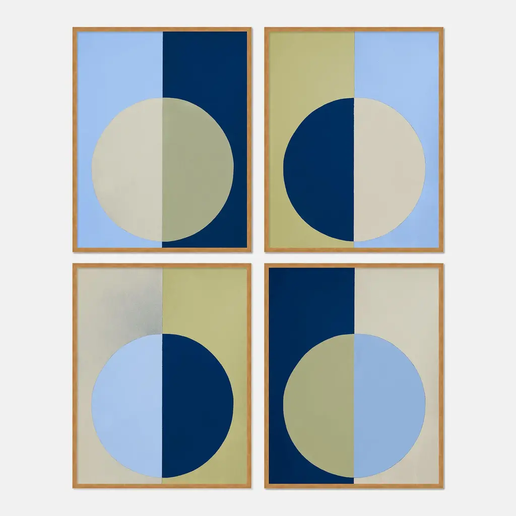 DESCRIPTION: Blue & Olive Forever Set of 4 by Stephanie Henderson in Gold Frame, Large Art Print SPECIFICATIONS: Type: Framed Paper. Individual Frame Size (in): 31.5x40. Orientation: Vertical. Flush/Float/Matted: Flush. Frame Color: Gold. Hanging Hardware: Picture Perfect. 4 pieces are included with this purchase. Overall set dimensions as pictured: 63x80. FRAMING: Each art work arrives framed and ready to hang. We use handmade frames with a plexiglass glazing front, because it offers less glare than standard glass. At this time, we only offer framed prints. ARTIST BIO: Stephanie Lear Henderson is a painter living in Ponte Vedra Beach, Florida. Her work can be found in collections throughout the US and Canada. Working primarily in hard-edge abstraction, she also occasionally paints representational works in oil. A native of Thomasville, Georgia, Stephanie earned a B.A. in English Literature from the University of Virginia and an M.A. in Journalism from the University of Georgia. Stephanie’s work revolves around bold, saturated color and how colors communicate with each other and affect the observer. Her paintings contain forms that are simple, allowing the colors to express themselves without complications. Stephanie’s work reveals focus, precision, and an insatiable appetite for evocative combinations of color. She revels in the challenge of painting perfectly clean lines freehand with a brush. No tape. No masking.Stephanie embraces the belief that color alters mood, outlook, and brings absolute joy to life. Stephanie's artwork has appeared in a multitued of publications including House Beautiful and The CUT.