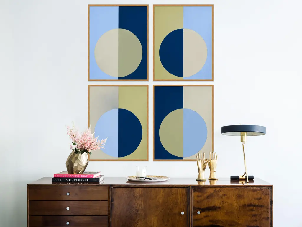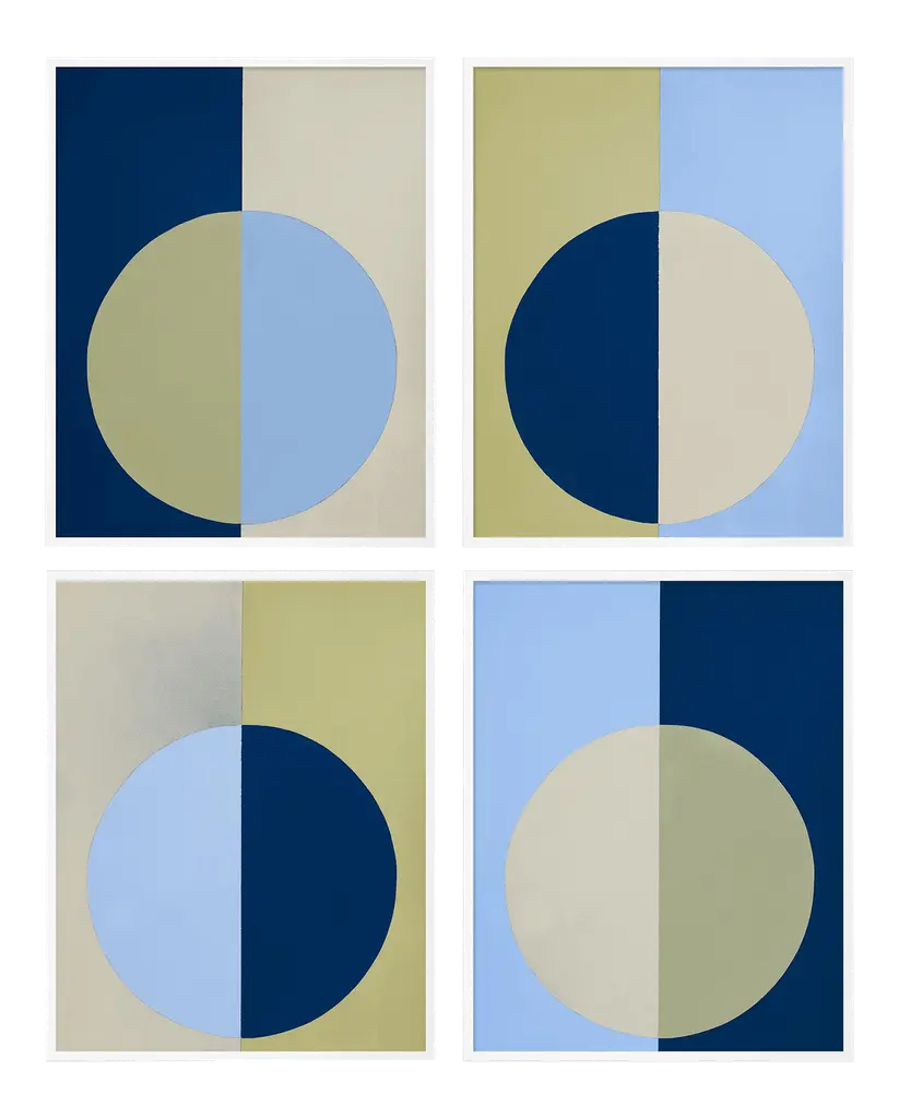 DESCRIPTION: Blue & Olive Forever Set of 4 by Stephanie Henderson in Gold Frame, Medium Art Print SPECIFICATIONS: Type: Framed Paper. Individual Frame Size (in): 28.5x36. Orientation: Vertical. Flush/Float/Matted: Flush. Frame Color: Gold. Hanging Hardware: Picture Perfect. 4 pieces are included with this purchase. Overall set dimensions as pictured: 57x72. FRAMING: Each art work arrives framed and ready to hang. We use handmade frames with a plexiglass glazing front, because it offers less glare than standard glass. At this time, we only offer framed prints. ARTIST BIO: Stephanie Lear Henderson is a painter living in Ponte Vedra Beach, Florida. Her work can be found in collections throughout the US and Canada. Working primarily in hard-edge abstraction, she also occasionally paints representational works in oil. A native of Thomasville, Georgia, Stephanie earned a B.A. in English Literature from the University of Virginia and an M.A. in Journalism from the University of Georgia. Stephanie’s work revolves around bold, saturated color and how colors communicate with each other and affect the observer. Her paintings contain forms that are simple, allowing the colors to express themselves without complications. Stephanie’s work reveals focus, precision, and an insatiable appetite for evocative combinations of color. She revels in the challenge of painting perfectly clean lines freehand with a brush. No tape. No masking.Stephanie embraces the belief that color alters mood, outlook, and brings absolute joy to life. Stephanie's artwork has appeared in a multitued of publications including House Beautiful and The CUT.