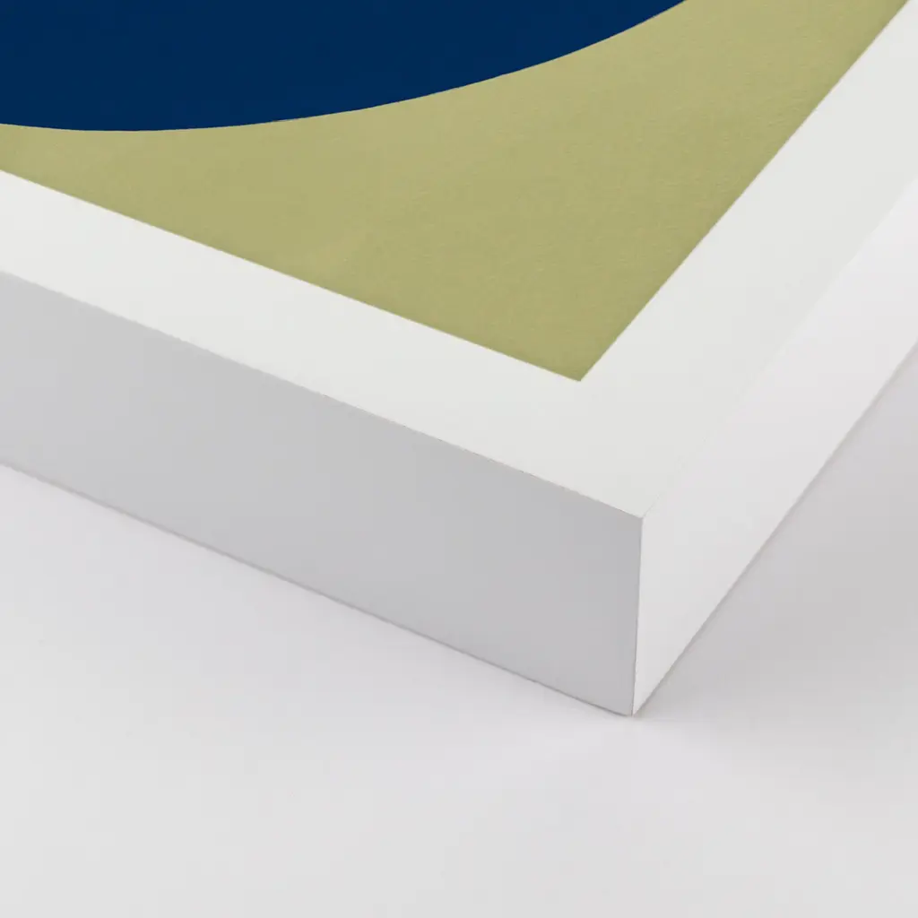DESCRIPTION: Blue & Olive Forever Set of 4 by Stephanie Henderson in White Frame, Small Art Print SPECIFICATIONS: Type: Framed Paper. Individual Frame Size (in): 19x24. Orientation: Vertical. Flush/Float/Matted: Flush. Frame Color: White. Hanging Hardware: Picture Perfect. 4 pieces are included with this purchase. Overall set dimensions as pictured: 38x48. FRAMING: Each art work arrives framed and ready to hang. We use handmade frames with a plexiglass glazing front, because it offers less glare than standard glass. At this time, we only offer framed prints. ARTIST BIO: Stephanie Lear Henderson is a painter living in Ponte Vedra Beach, Florida. Her work can be found in collections throughout the US and Canada. Working primarily in hard-edge abstraction, she also occasionally paints representational works in oil. A native of Thomasville, Georgia, Stephanie earned a B.A. in English Literature from the University of Virginia and an M.A. in Journalism from the University of Georgia. Stephanie’s work revolves around bold, saturated color and how colors communicate with each other and affect the observer. Her paintings contain forms that are simple, allowing the colors to express themselves without complications. Stephanie’s work reveals focus, precision, and an insatiable appetite for evocative combinations of color. She revels in the challenge of painting perfectly clean lines freehand with a brush. No tape. No masking.Stephanie embraces the belief that color alters mood, outlook, and brings absolute joy to life. Stephanie's artwork has appeared in a multitued of publications including House Beautiful and The CUT.