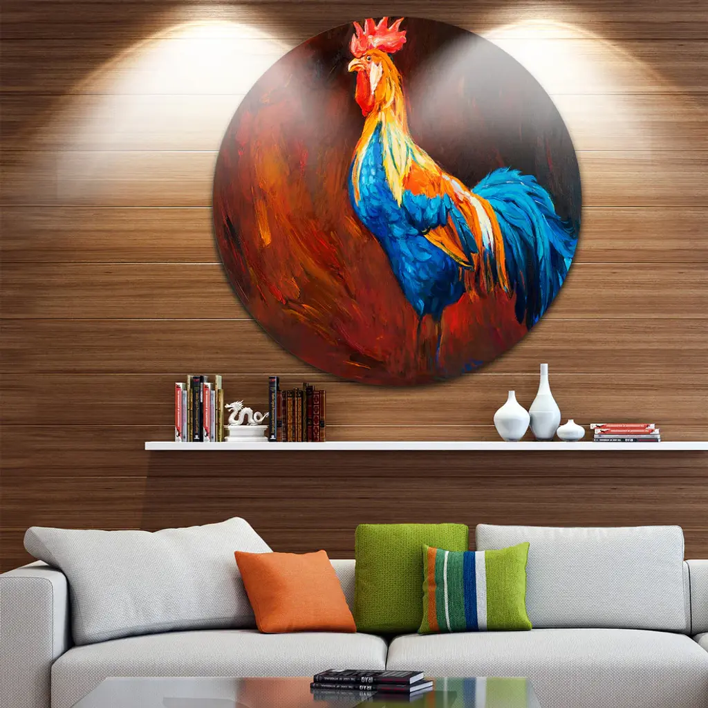 Blue And Orange Rooster, Animal Round Metal Wall Art, 11"
