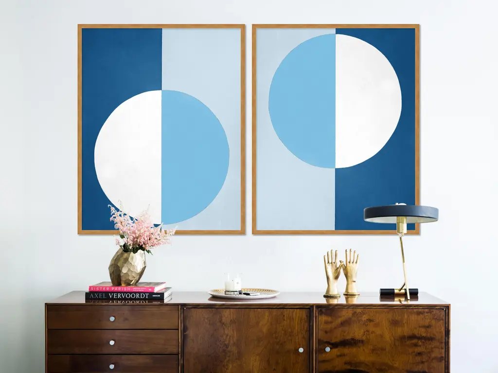 DESCRIPTION: Blue & White Forever Diptych by Stephanie Henderson in Gold Frame, Medium Art Print SPECIFICATIONS: Type: Framed Paper. Individual Frame Size (in): 28.5x36. Orientation: Vertical. Flush/Float/Matted: Flush. Frame Color: Gold. Hanging Hardware: Picture Perfect. 2 pieces are included with this purchase. Overall set dimensions as pictured: 57x36. FRAMING: Each art work arrives framed and ready to hang. We use handmade frames with a plexiglass glazing front, because it offers less glare than standard glass. At this time, we only offer framed prints. ARTIST BIO: Stephanie Lear Henderson is a painter living in Ponte Vedra Beach, Florida. Her work can be found in collections throughout the US and Canada. Working primarily in hard-edge abstraction, she also occasionally paints representational works in oil. A native of Thomasville, Georgia, Stephanie earned a B.A. in English Literature from the University of Virginia and an M.A. in Journalism from the University of Georgia. Stephanie’s work revolves around bold, saturated color and how colors communicate with each other and affect the observer. Her paintings contain forms that are simple, allowing the colors to express themselves without complications. Stephanie’s work reveals focus, precision, and an insatiable appetite for evocative combinations of color. She revels in the challenge of painting perfectly clean lines freehand with a brush. No tape. No masking.Stephanie embraces the belief that color alters mood, outlook, and brings absolute joy to life. Stephanie's artwork has appeared in a multitued of publications including House Beautiful and The CUT.