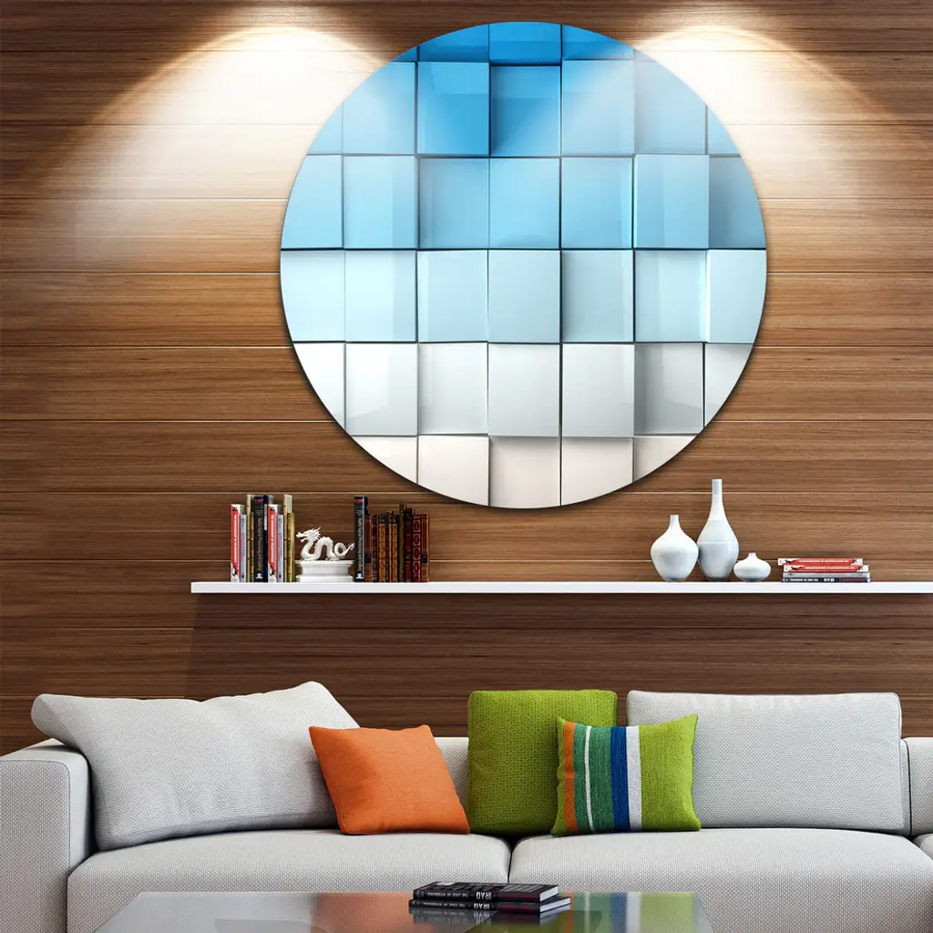 Blue And White Mosaic Cubes, Contemporary Round Wall Art, 23"