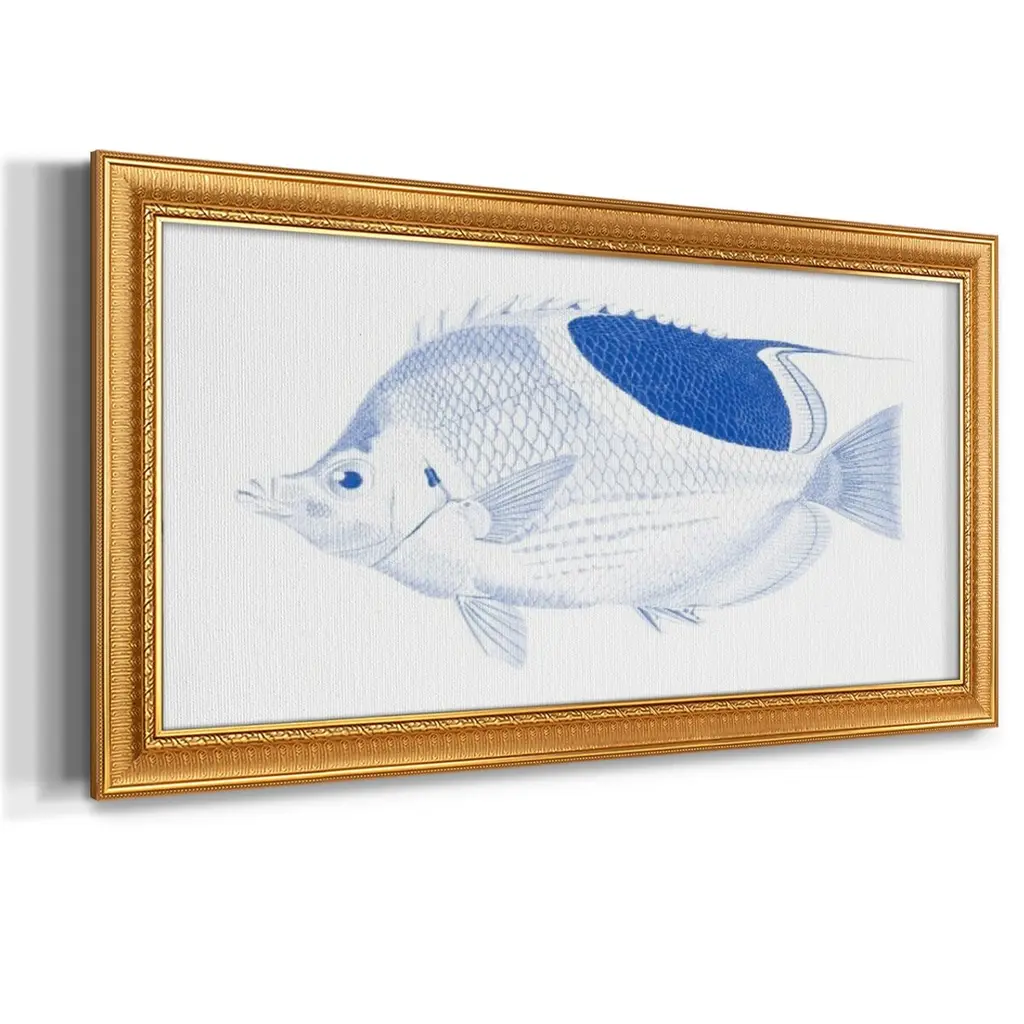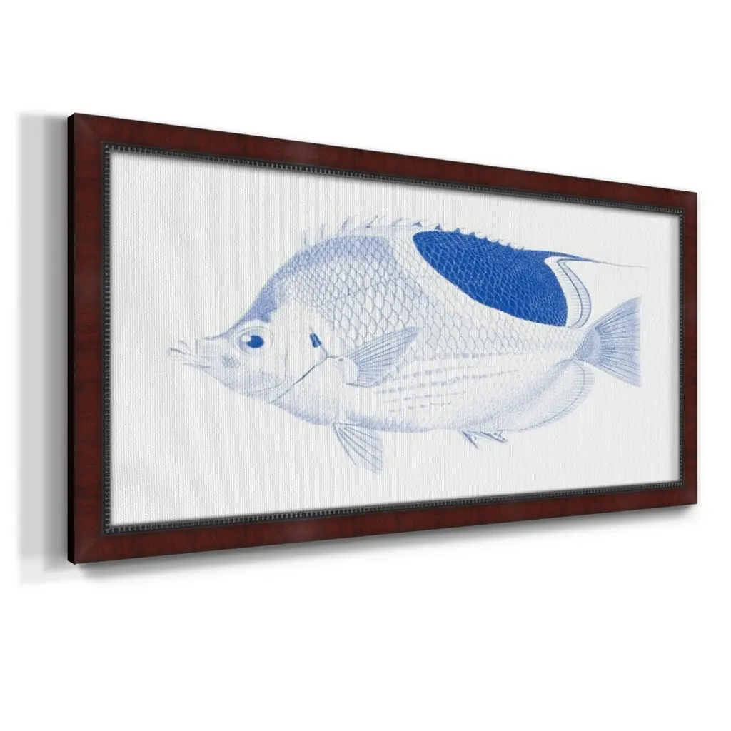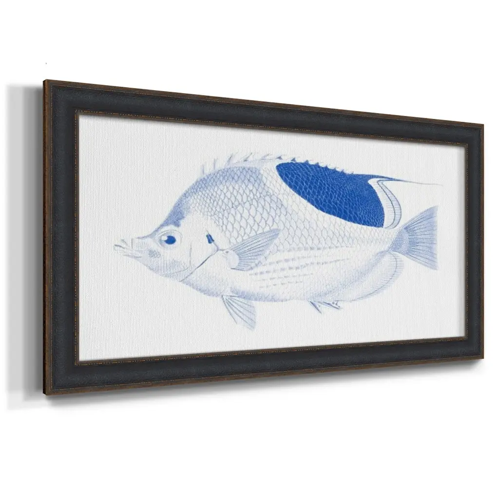 Blue & White Tropical Fish I Premium Framed Canvas- Ready to Hang A Premium Framed Canvas created to last. Framed in distressed wood and available in an array of sizes and colors Featuring a beveled a solid wood stretcher bar, each piece comes ready to hand 3 SIZES AVAILABLE 21''X37'' - Overall Size 25''X45'' - Overall Size 29''x53'' - Overall Size Each piece is made to order. Each piece comes with hanging hardware. Made in the USA Ready to Hang Giclee Paper Print Acrylic Glass Beveled Matt Board