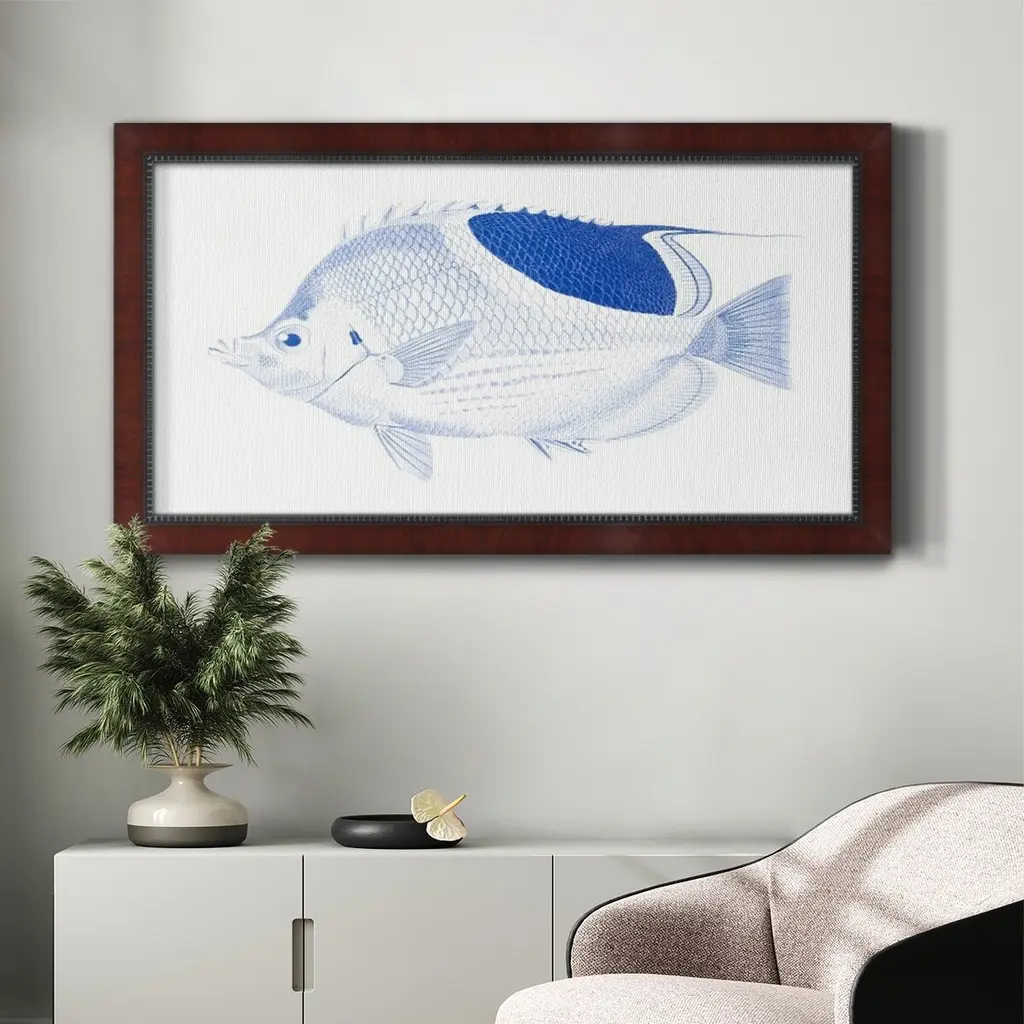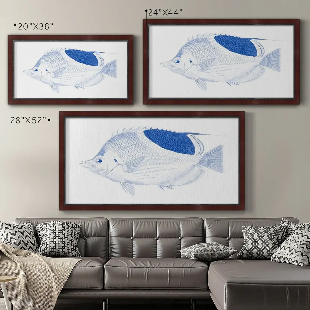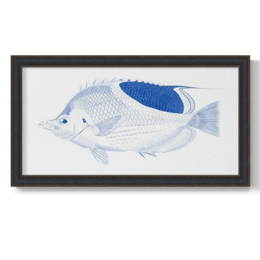 Blue & White Tropical Fish I Premium Framed Canvas- Ready to Hang A Premium Framed Canvas created to last. Framed in distressed wood and available in an array of sizes and colors Featuring a beveled a solid wood stretcher bar, each piece comes ready to hand 3 SIZES AVAILABLE 21''X37'' - Overall Size 25''X45'' - Overall Size 29''x53'' - Overall Size Each piece is made to order. Each piece comes with hanging hardware. Made in the USA Ready to Hang Giclee Paper Print Acrylic Glass Beveled Matt Board