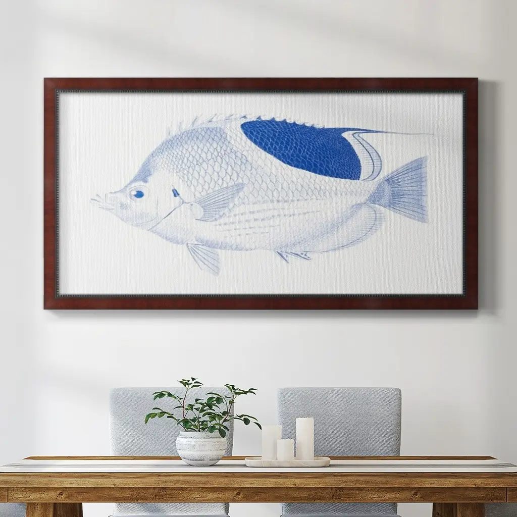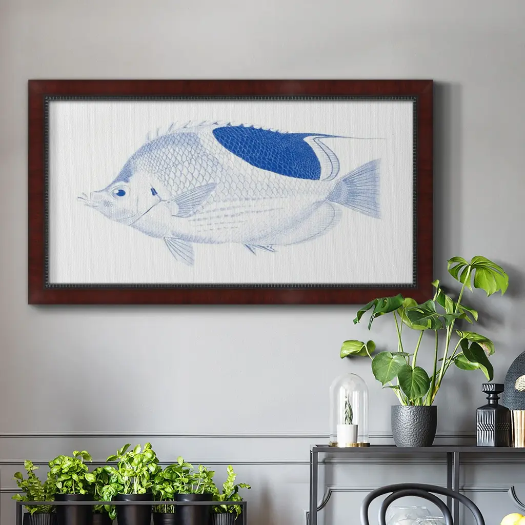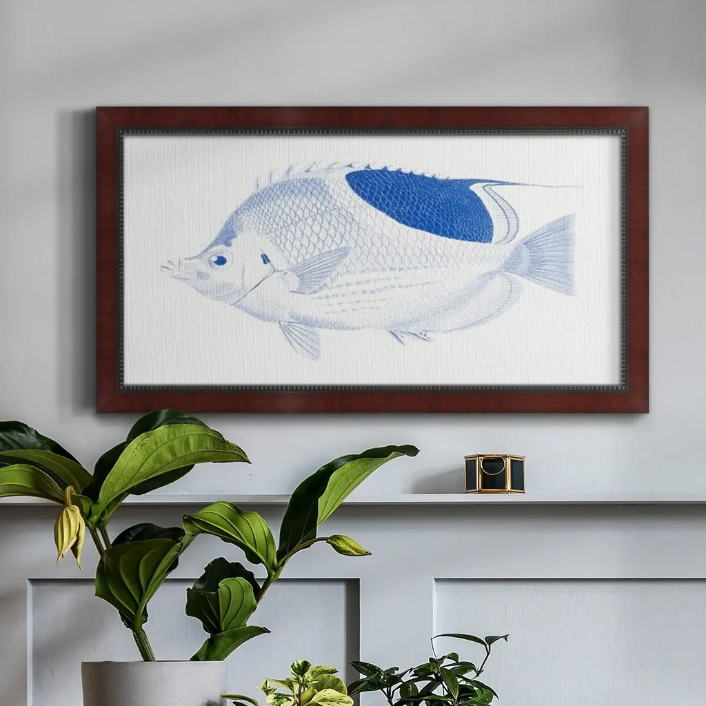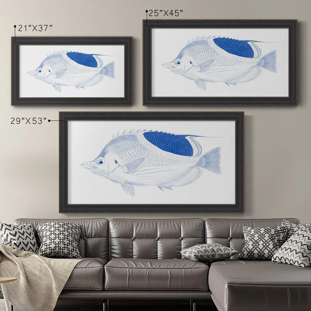 Blue & White Tropical Fish I Premium Framed Canvas- Ready to Hang A Premium Framed Canvas created to last. Framed in distressed wood and available in an array of sizes and colors Featuring a beveled a solid wood stretcher bar, each piece comes ready to hand 3 SIZES AVAILABLE 21''X37'' - Overall Size 25''X45'' - Overall Size 29''x53'' - Overall Size Each piece is made to order. Each piece comes with hanging hardware. Made in the USA Ready to Hang Giclee Paper Print Acrylic Glass Beveled Matt Board