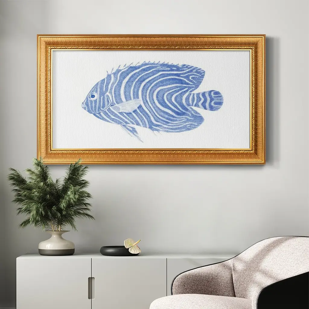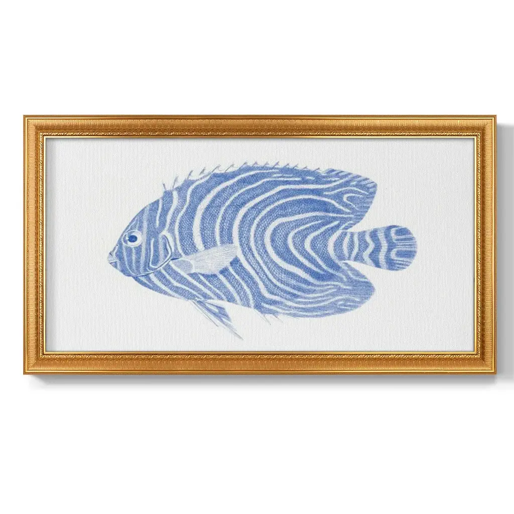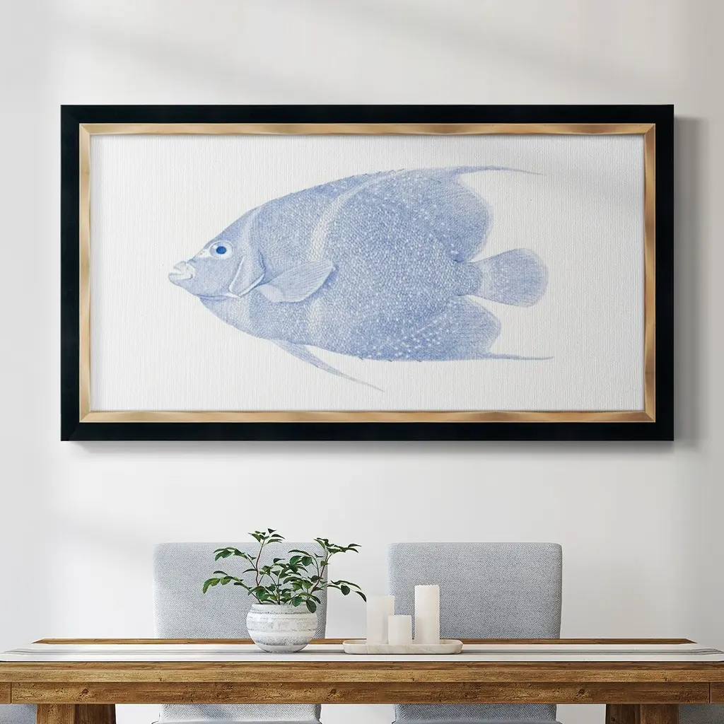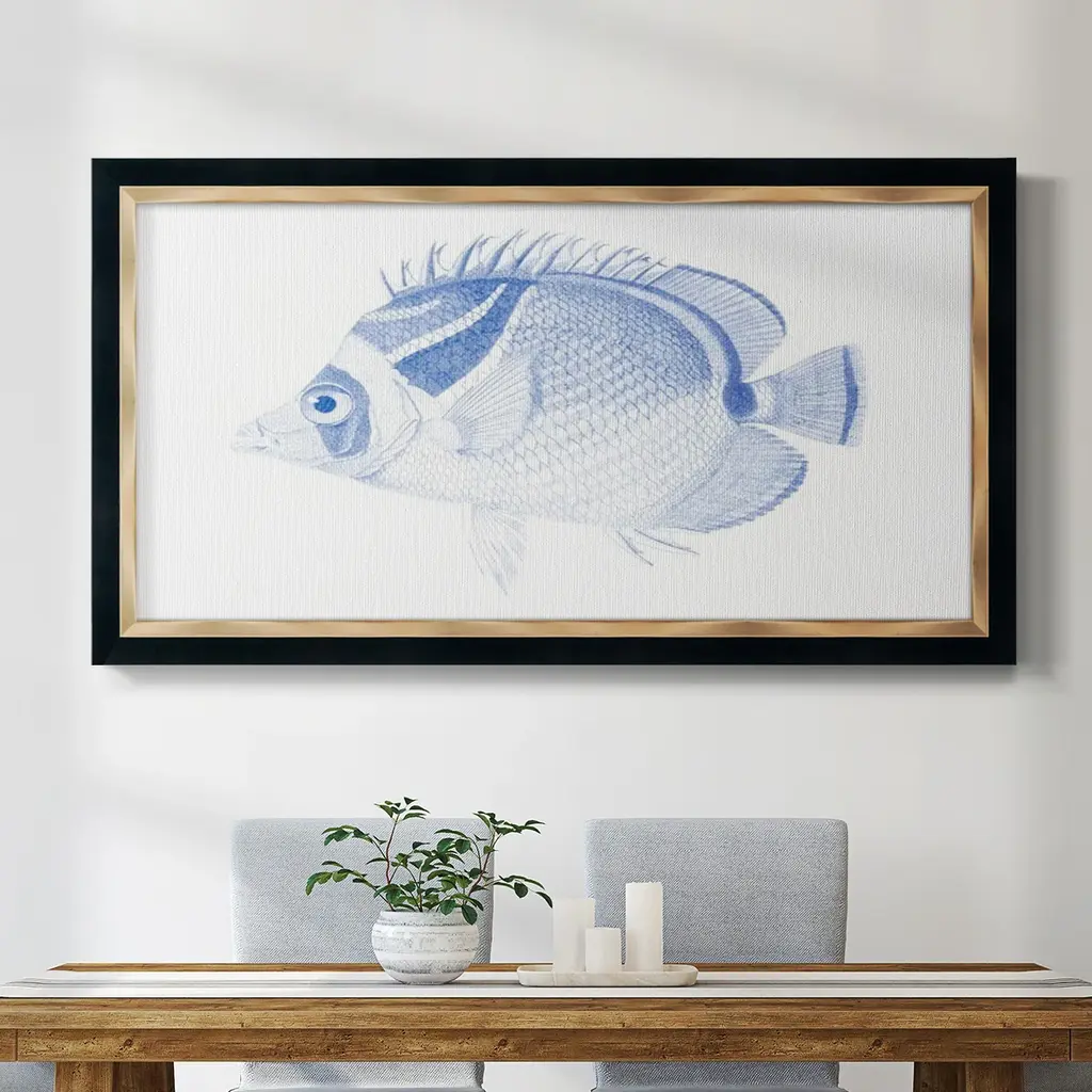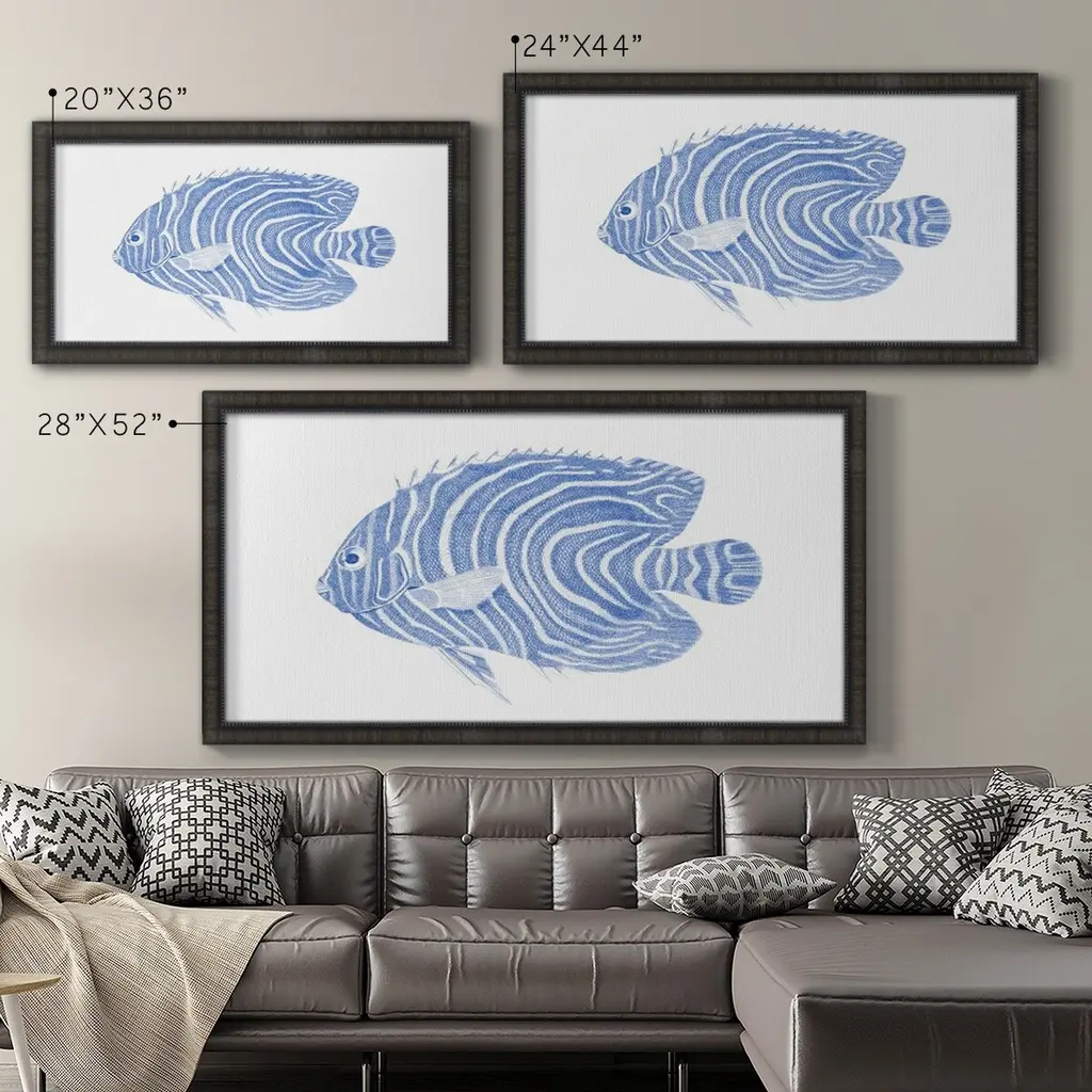 Blue & White Tropical Fish II Premium Framed Canvas- Ready to Hang A Premium Framed Canvas created to last. Framed in distressed wood and available in an array of sizes and colors Featuring a beveled a solid wood stretcher bar, each piece comes ready to hand 3 SIZES AVAILABLE 21''X37'' - Overall Size 25''X45'' - Overall Size 29''x53'' - Overall Size Each piece is made to order. Each piece comes with hanging hardware. Made in the USA Ready to Hang Giclee Paper Print Acrylic Glass Beveled Matt Board