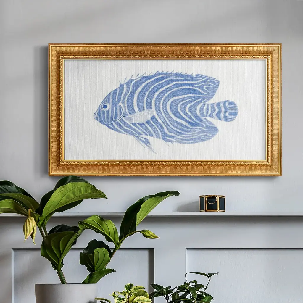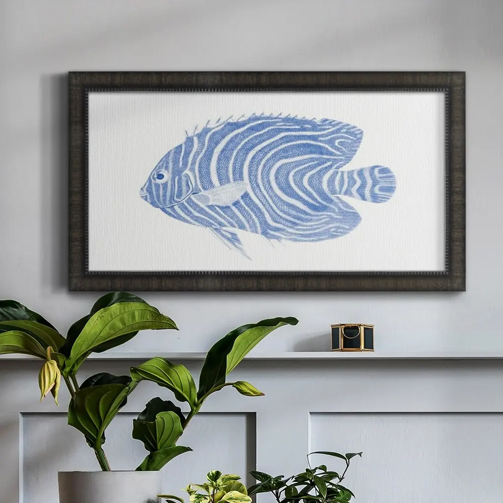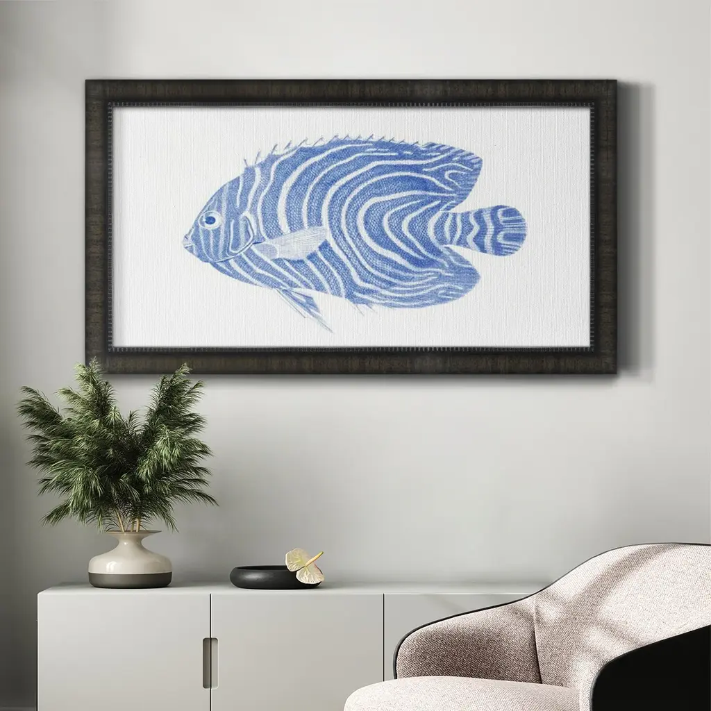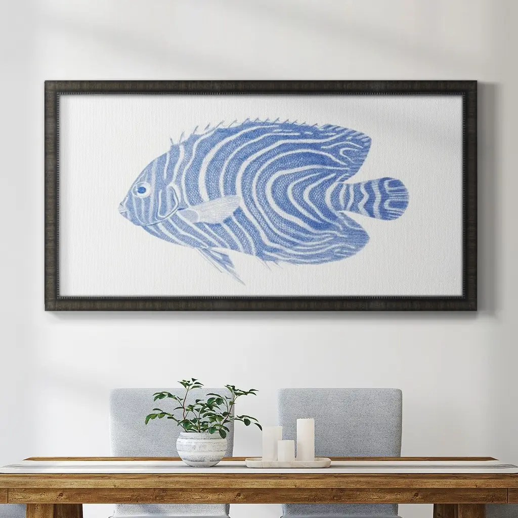Blue & White Tropical Fish II Premium Framed Canvas- Ready to Hang A Premium Framed Canvas created to last. Framed in distressed wood and available in an array of sizes and colors Featuring a beveled a solid wood stretcher bar, each piece comes ready to hand 3 SIZES AVAILABLE 21''X37'' - Overall Size 25''X45'' - Overall Size 29''x53'' - Overall Size Each piece is made to order. Each piece comes with hanging hardware. Made in the USA Ready to Hang Giclee Paper Print Acrylic Glass Beveled Matt Board