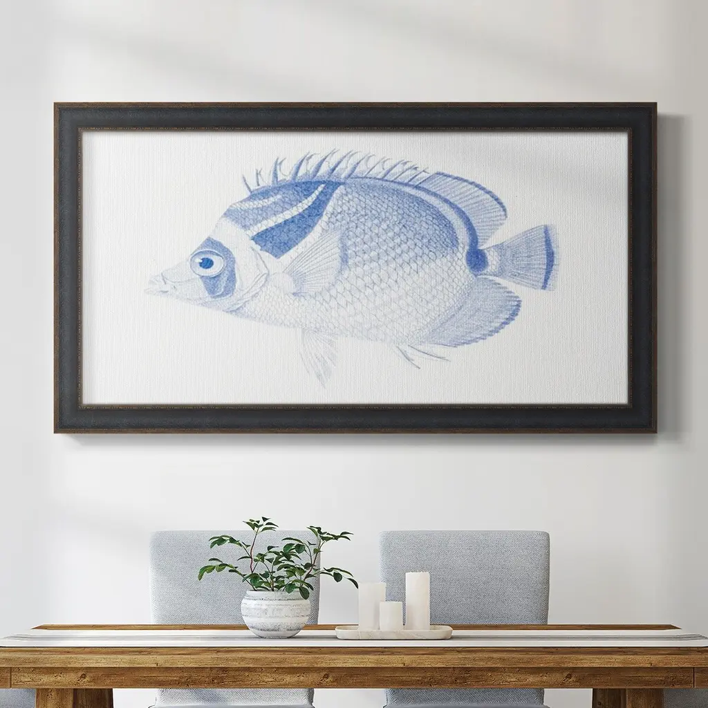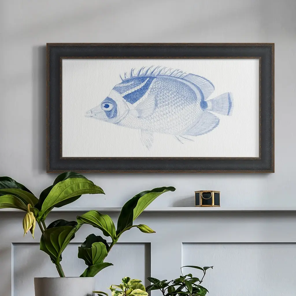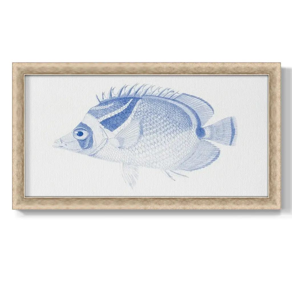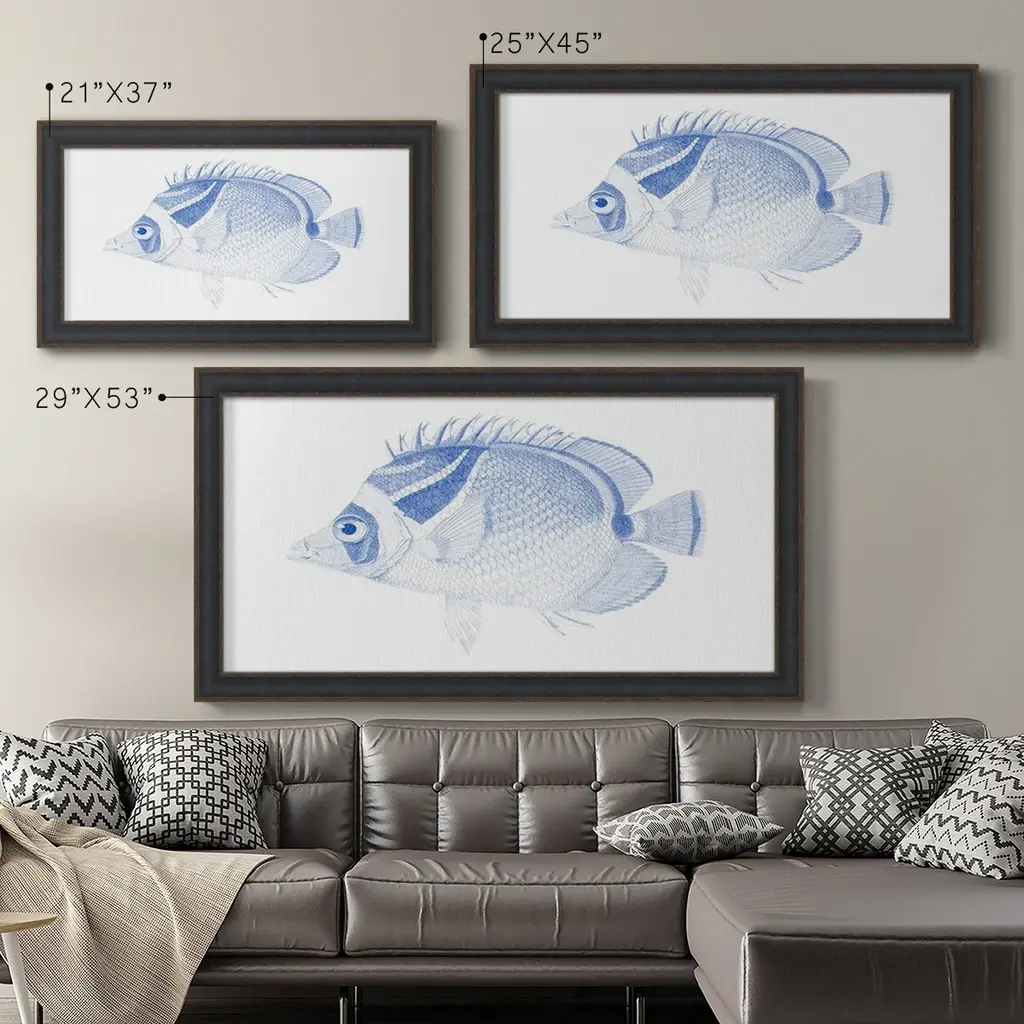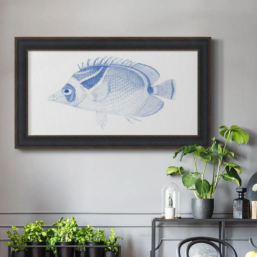 Blue & White Tropical Fish IV Premium Framed Canvas- Ready to Hang A Premium Framed Canvas created to last. Framed in distressed wood and available in an array of sizes and colors Featuring a beveled a solid wood stretcher bar, each piece comes ready to hand 3 SIZES AVAILABLE 21''X37'' - Overall Size 25''X45'' - Overall Size 29''x53'' - Overall Size Each piece is made to order. Each piece comes with hanging hardware. Made in the USA Ready to Hang Giclee Paper Print Acrylic Glass Beveled Matt Board