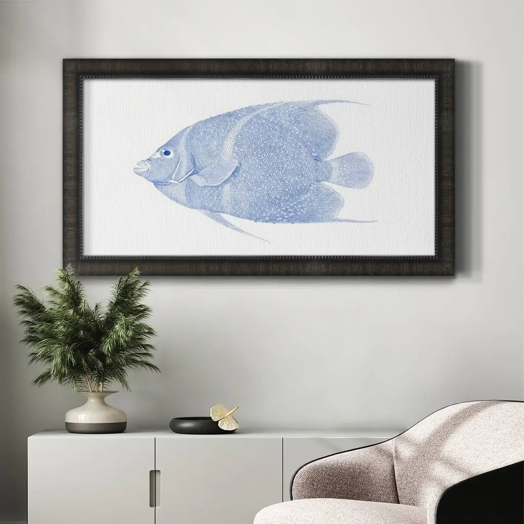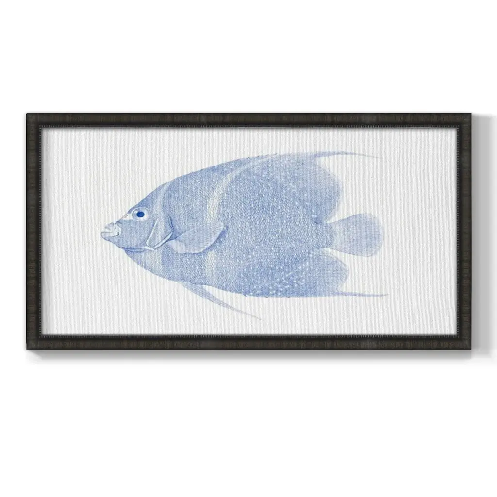 Blue & White Tropical Fish V Premium Framed Canvas- Ready to Hang A Premium Framed Canvas created to last. Framed in distressed wood and available in an array of sizes and colors Featuring a beveled a solid wood stretcher bar, each piece comes ready to hand 3 SIZES AVAILABLE 21''X37'' - Overall Size 25''X45'' - Overall Size 29''x53'' - Overall Size Each piece is made to order. Each piece comes with hanging hardware. Made in the USA Ready to Hang Giclee Paper Print Acrylic Glass Beveled Matt Board