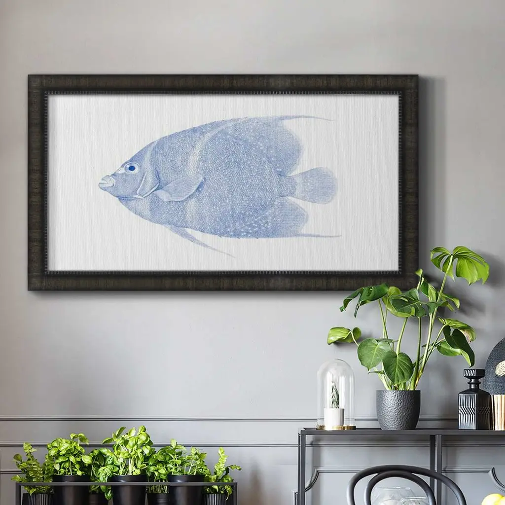 Blue & White Tropical Fish V Premium Framed Canvas- Ready to Hang A Premium Framed Canvas created to last. Framed in distressed wood and available in an array of sizes and colors Featuring a beveled a solid wood stretcher bar, each piece comes ready to hand 3 SIZES AVAILABLE 21''X37'' - Overall Size 25''X45'' - Overall Size 29''x53'' - Overall Size Each piece is made to order. Each piece comes with hanging hardware. Made in the USA Ready to Hang Giclee Paper Print Acrylic Glass Beveled Matt Board