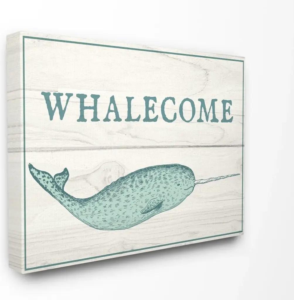 Blue & White Whalecome Welcome Narwhal Planks Canvas Wall Art, 24"x30"