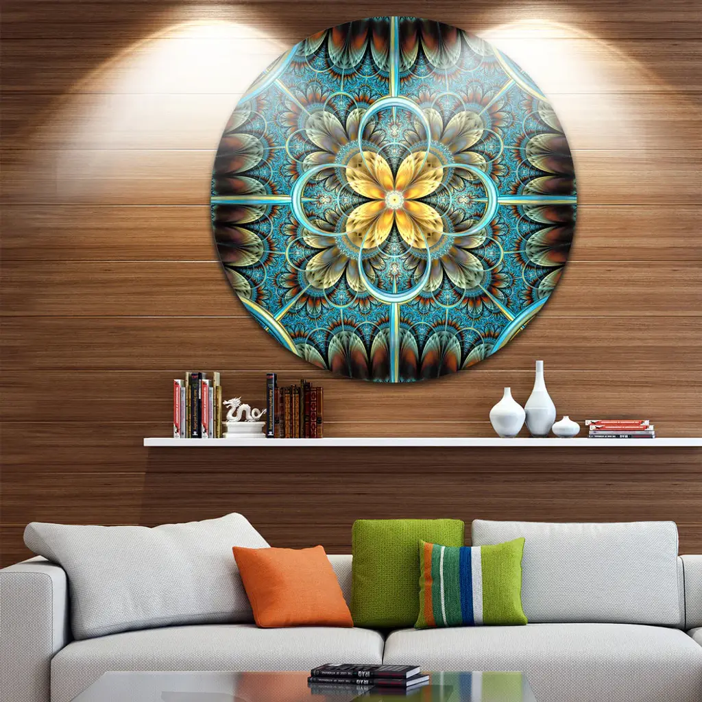 Bring Contemporary Abstraction to your home with this large Circle Metal wall art. This Blue and Yellow Large Fractal Flower Design Metal Artwork makes it the focal point of any room or office. - White Gloss Coating ensures colors are extra vibrant with light reflection.- Aluminum grade Sheet Metal with 1 inch mounting frame on the back giving the illusion that the artwork is floating on the wall..- Mounting Brackets are included along with instructions.- High Quality Digital images are created directly into a glossy aluminum panel producing a stunning and captivating print into the glossy finish of the metal.- Water, Fire and Scratch resistant HD Aluminum panels.- Looks better than any photo paper and guaranteed to last at least 20 years- Easy to clean with a microfiber cloth. Colors are far superior to regular Canvas Art. - Easy to Hang