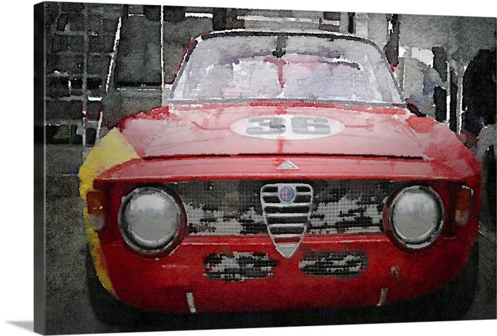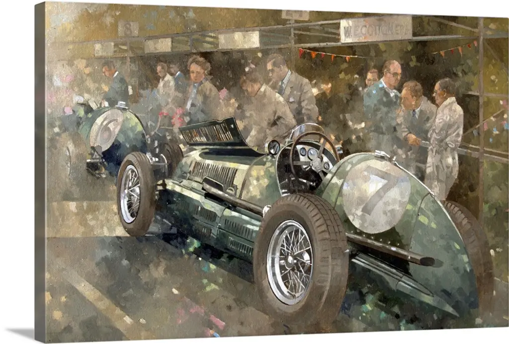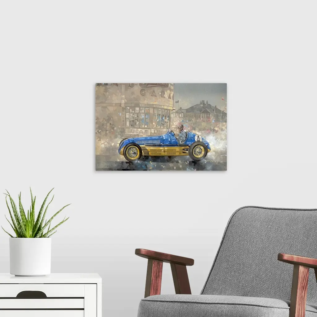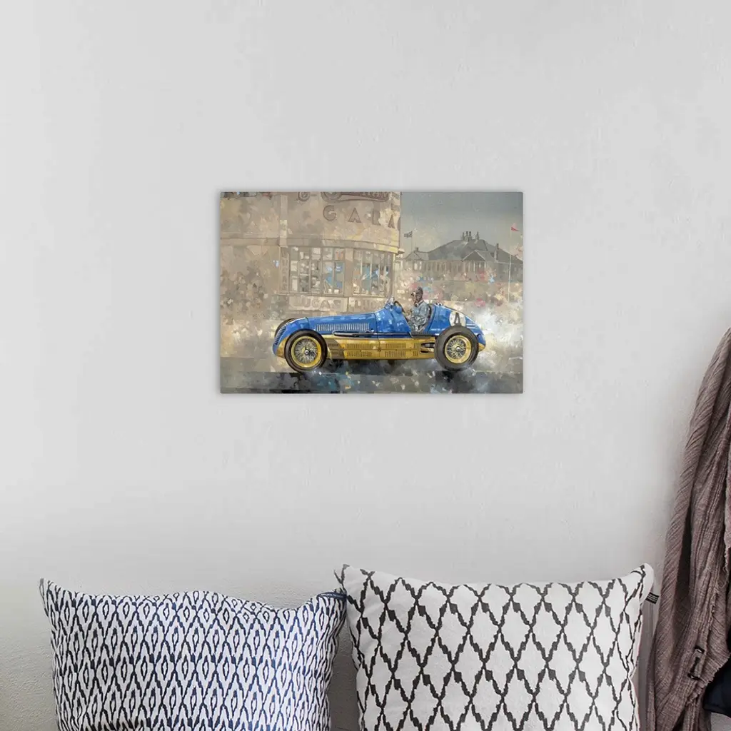 Contemporary oil painting of a race car driver in a vintage Maserati against a softened background.