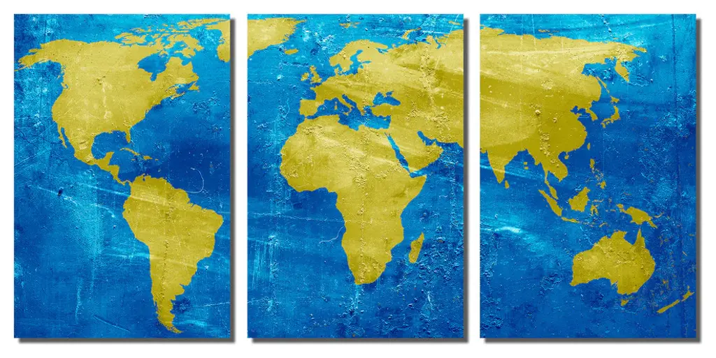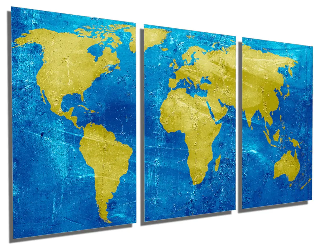 Blue And Yellow World Map Metal Print 3 Panel Split, Triptych Wall Art, 48x24