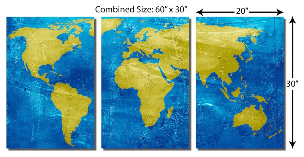 60"œ x 30"œ total size. Ready To Hang! (3 pieces - 20"œ x 30"œ each). 3 Panel Split (Triptych) Abstract art World Map Metal Print ft. shades of light blue and yellow colors. Modern metal wall art for home or office wall decor & interior design. Printed on Luxurious, HD aluminum glossy metal panels. Multi panel art.. HD aluminum panels. Metal print wall art. Includes Shadow Wall Mount on the back.• Aluminum Metal Wall Art• Made in USA• Ready to hang - No assembly required• Shadow mount hardware on the back• 0.045"œ thick HD Aluminum Panels• Scratch resistant, glossy finish• Superb color clarity, luxurious prints• Epson printing process• For indoor or moisture rich environment use• Easy to clean. Gently wipe with microfiber cloth.