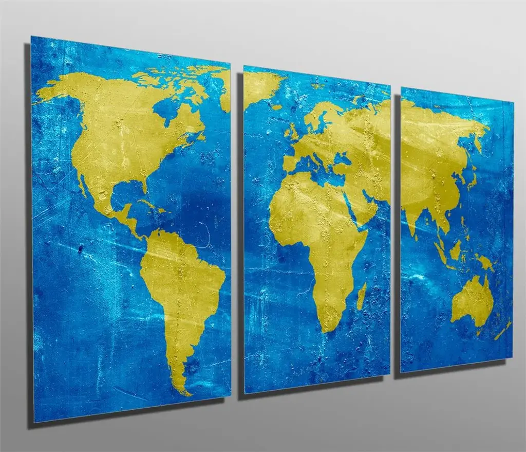 Blue And Yellow World Map Metal Print 3 Panel Split, Triptych Wall Art, 60x30