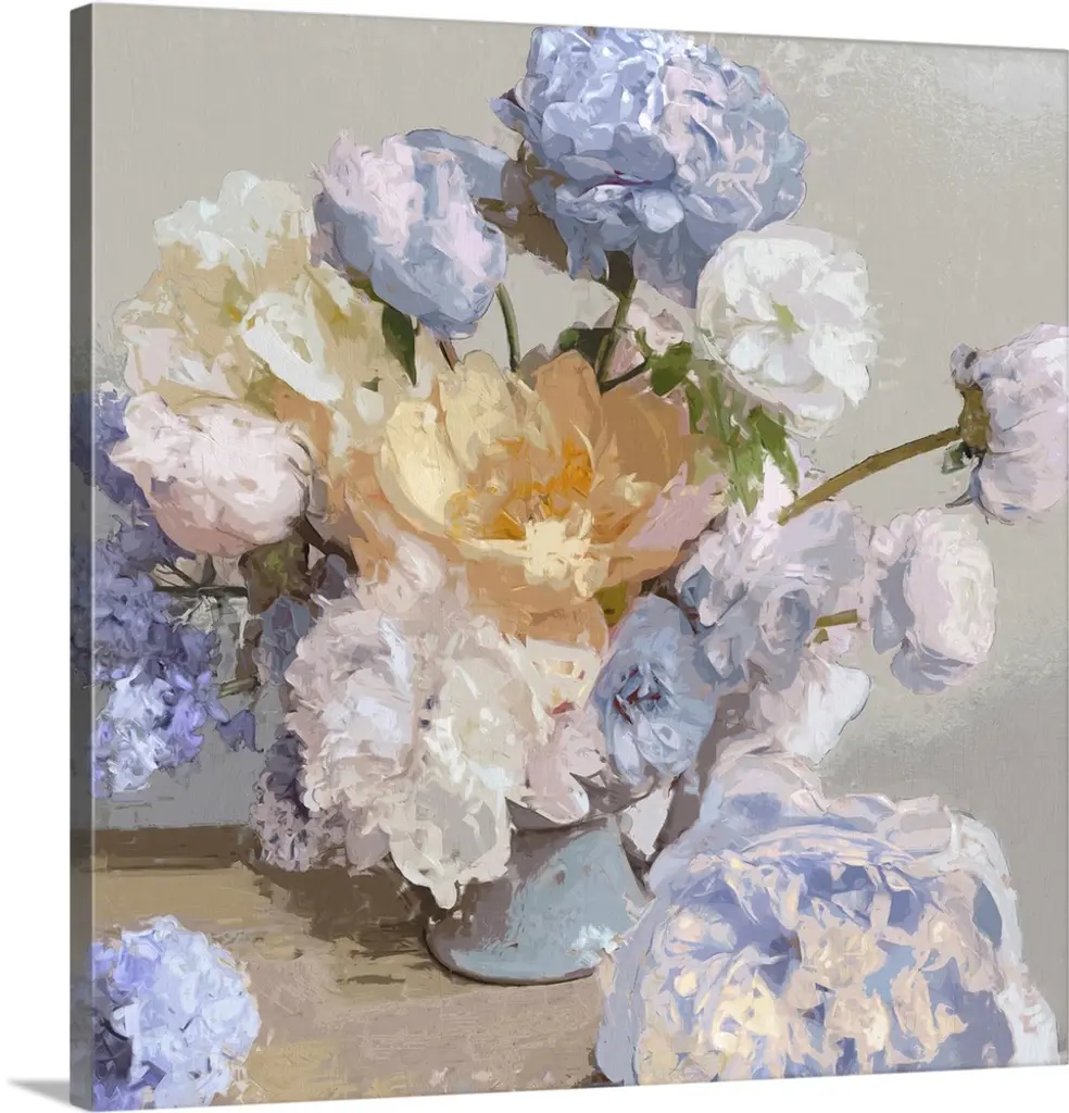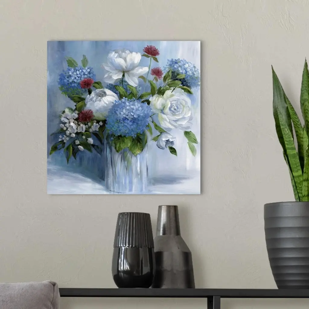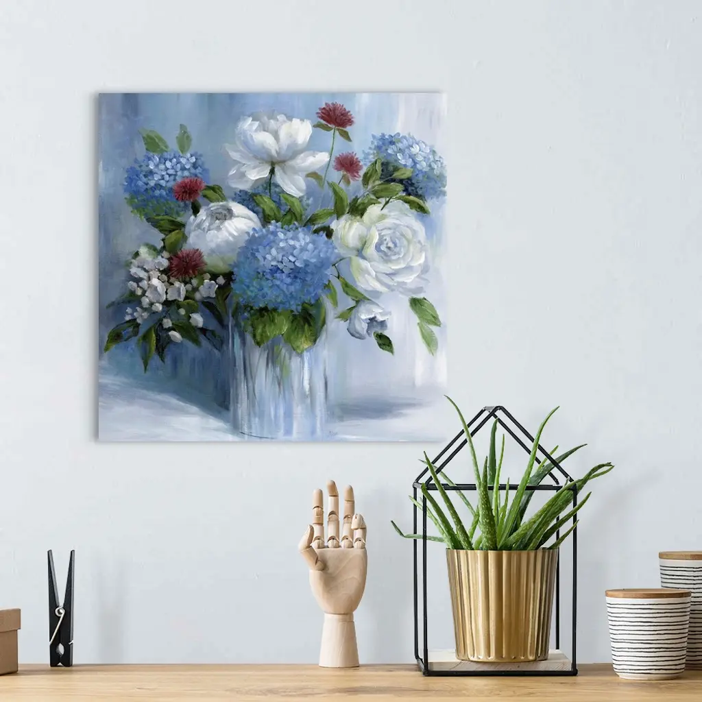 Square still life painting of a floral arrangement with blue tones.