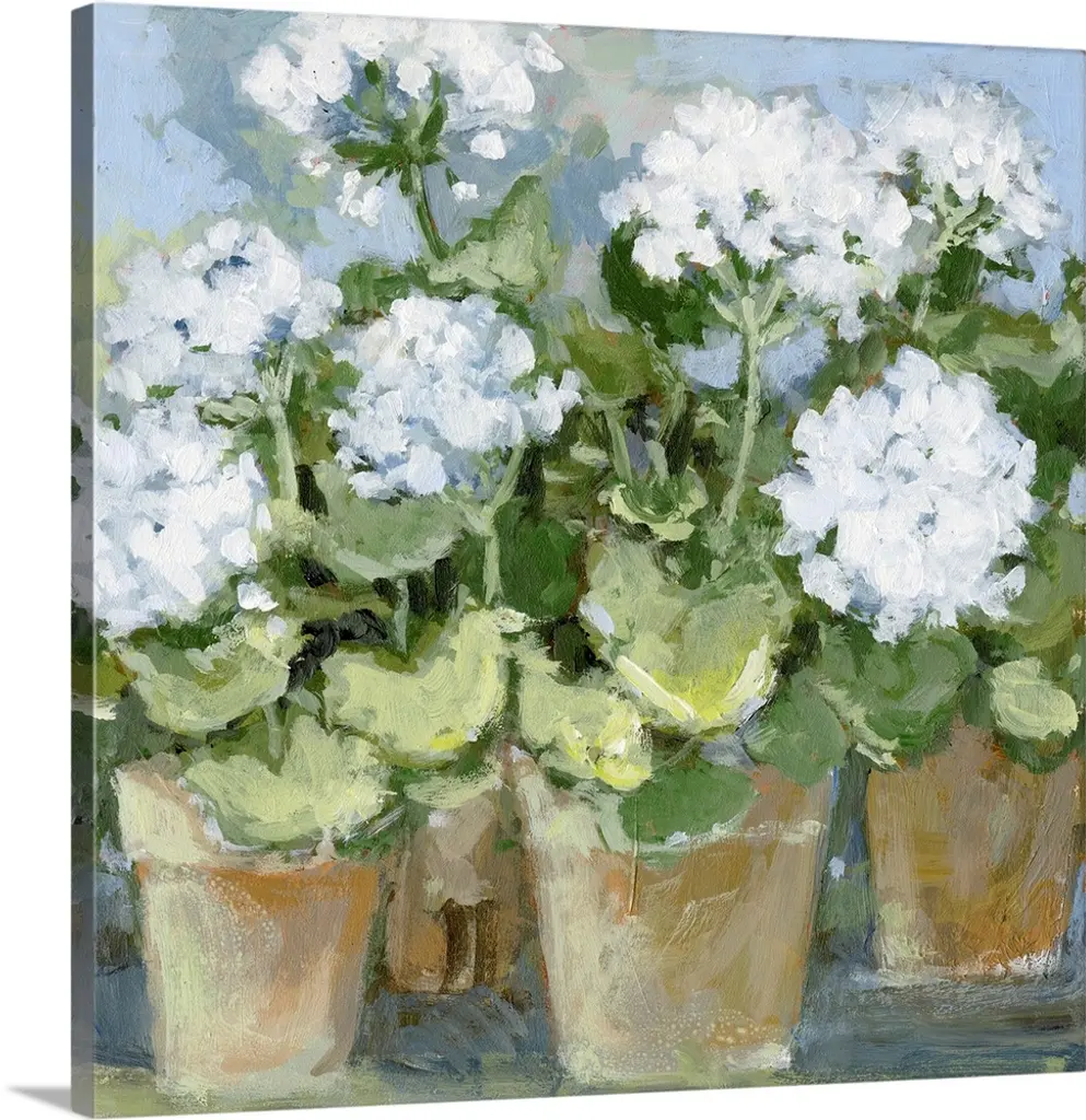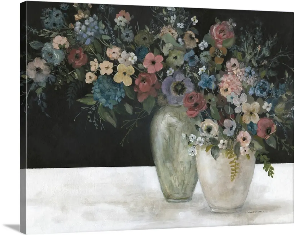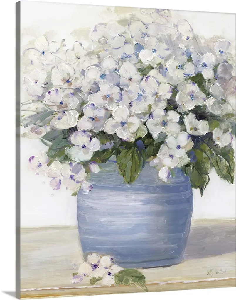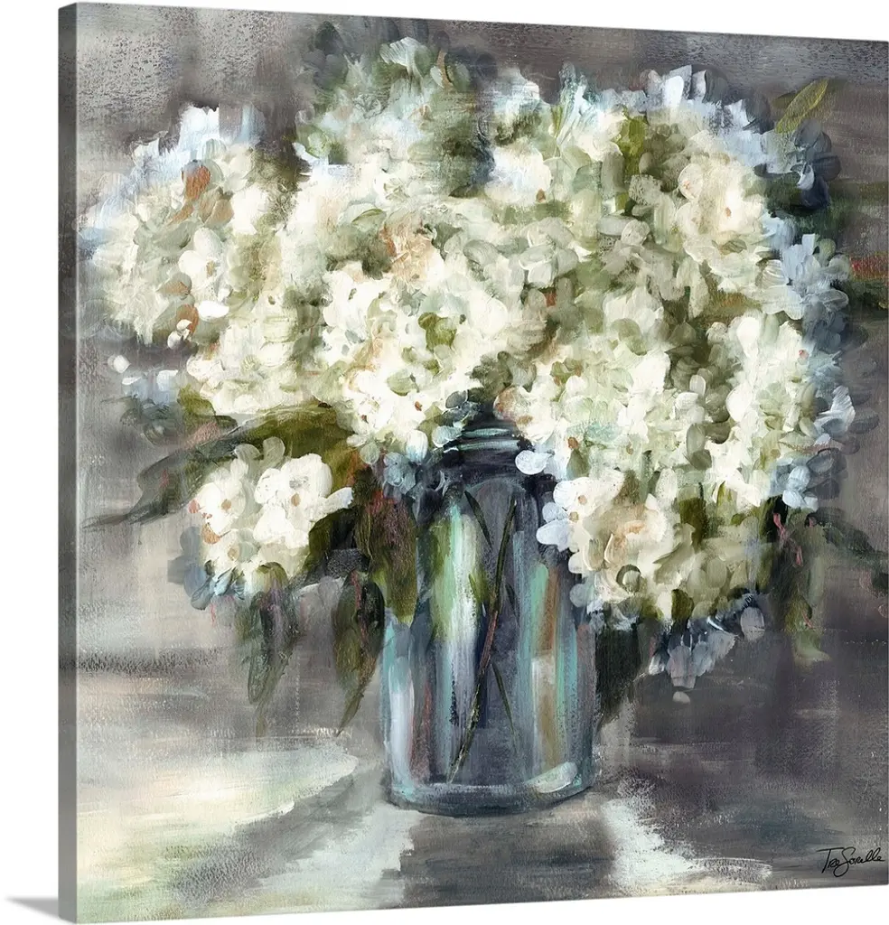 Square still life painting of a floral arrangement with blue tones.