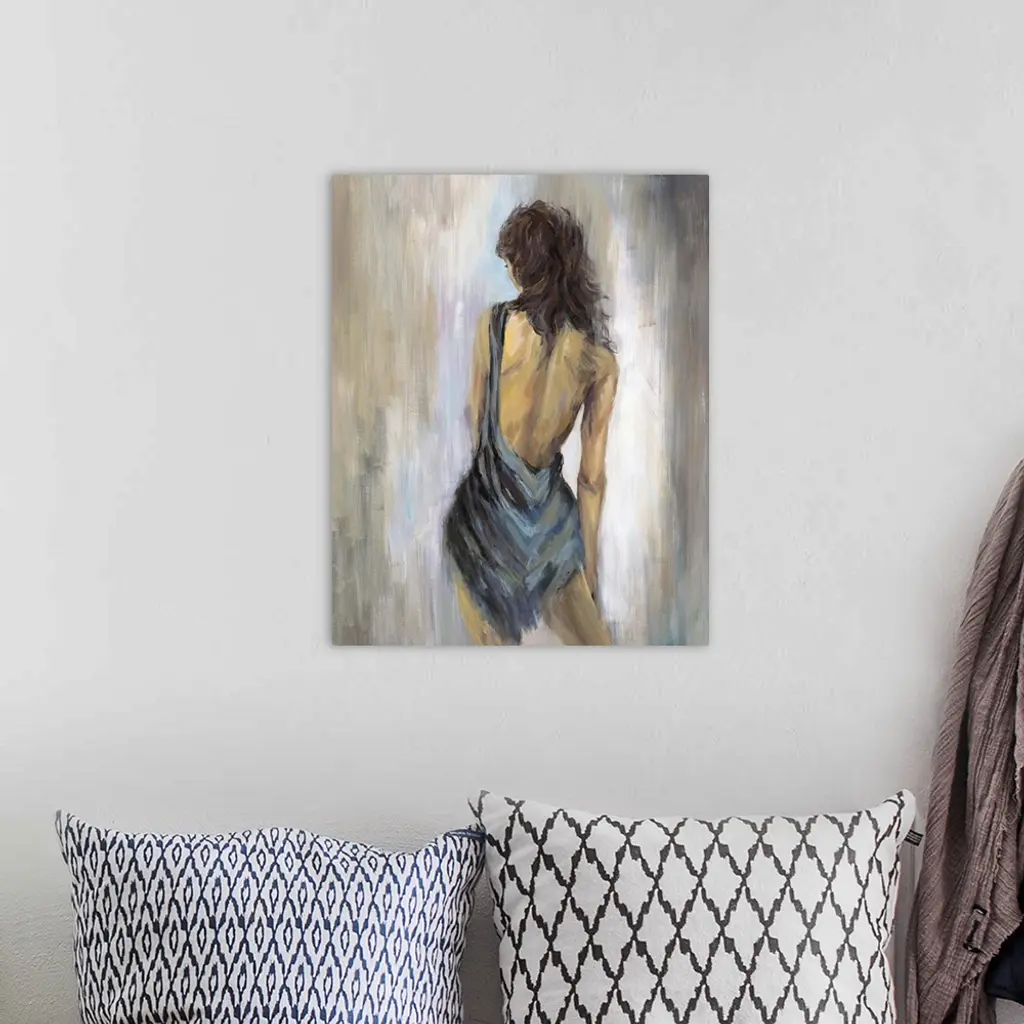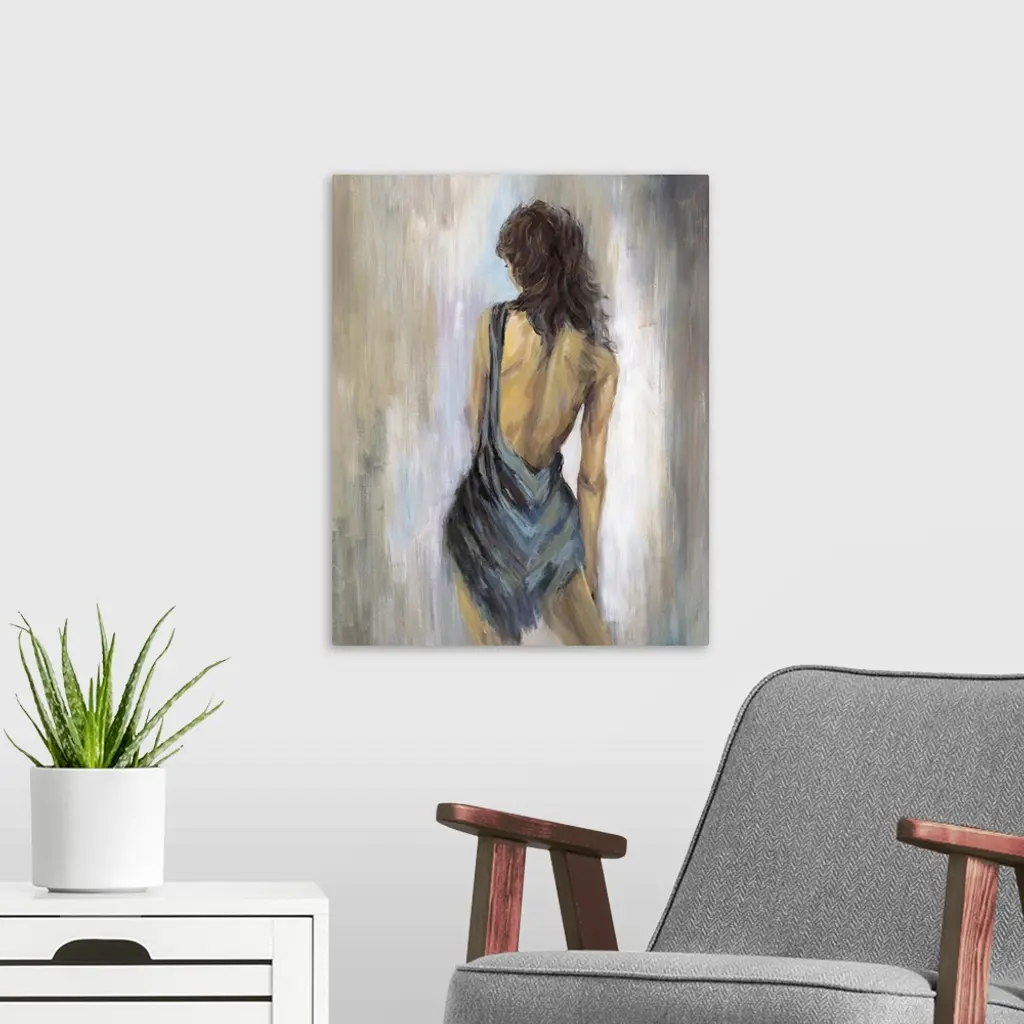 Home decor artwork of a rear view of a woman wearing a blue backless dress.