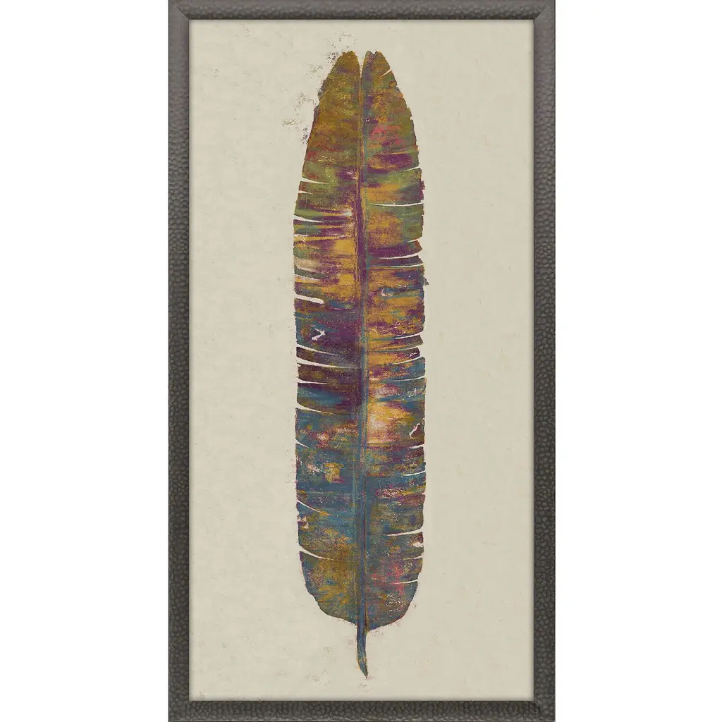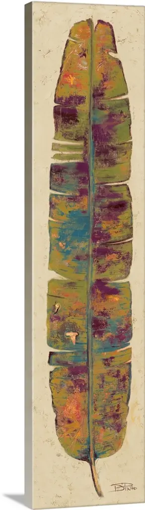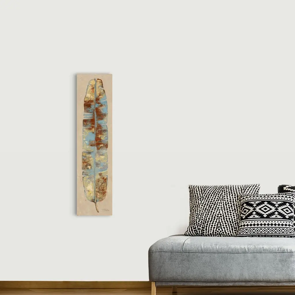 Contemporary artwork of a long, broad leaf in blue and brown shades.