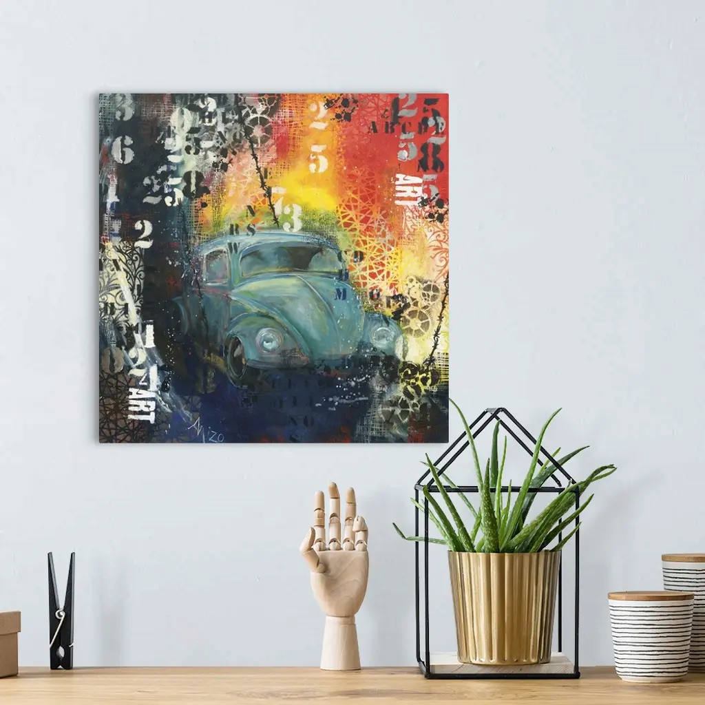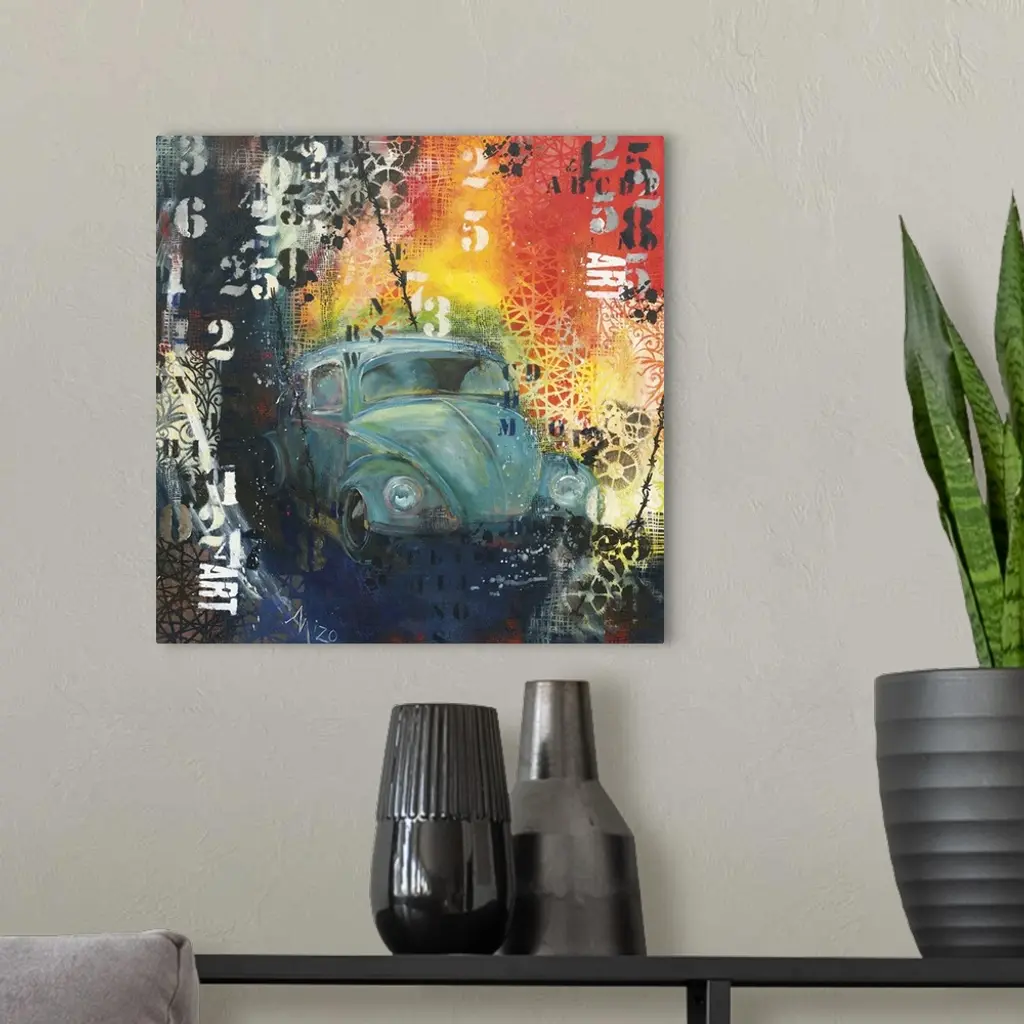 Painting of a blue Volkswagen beetle embellished with paint splatters and stenciled numbers.