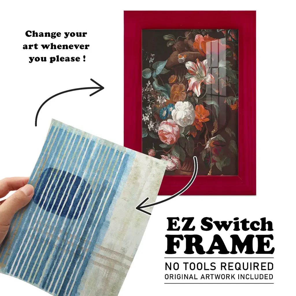 Blue Blue Horizon I -EZ SWITCH Framed Print w/glass-Cherry Red A delightful, framed print. Featuring a solid wood frame with real wood glass. This premium print is giclee quality. In addition, every frame features a removable back and table top stand. This allows you to change your art in the future or to just stand the art on a table for a new look. We are sure you'll enjoy our new series of EZ SWITCH Framed Art. Solid Wood Frame Real Glass Removable / Replaceable Art Built in Tabletop Stand Sizes range from 4x6 up to 12x15 - buy just one or pair them up as sets as you see fit.