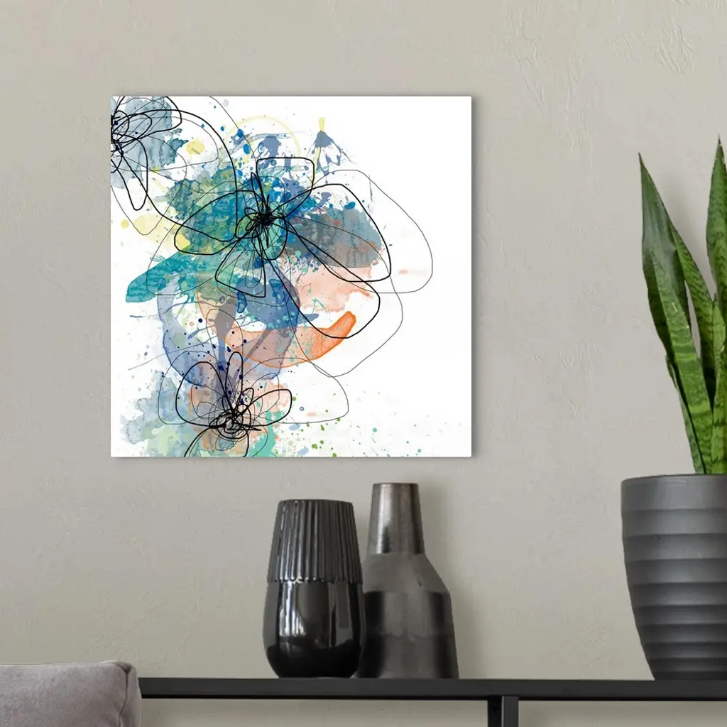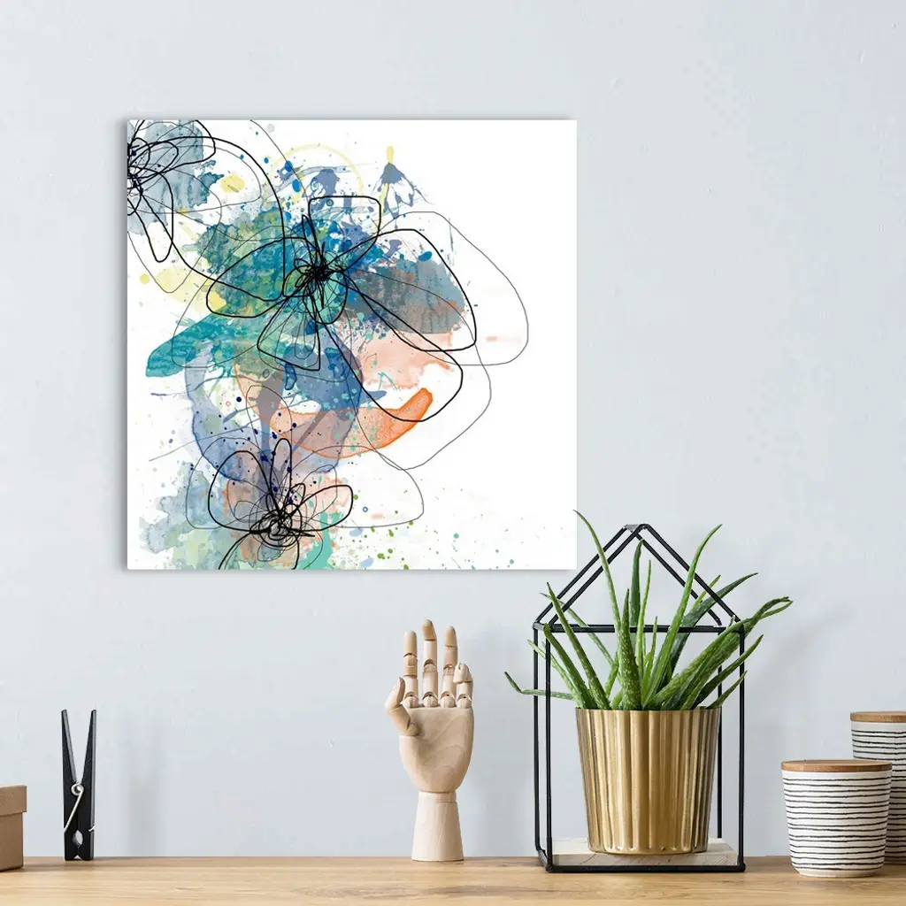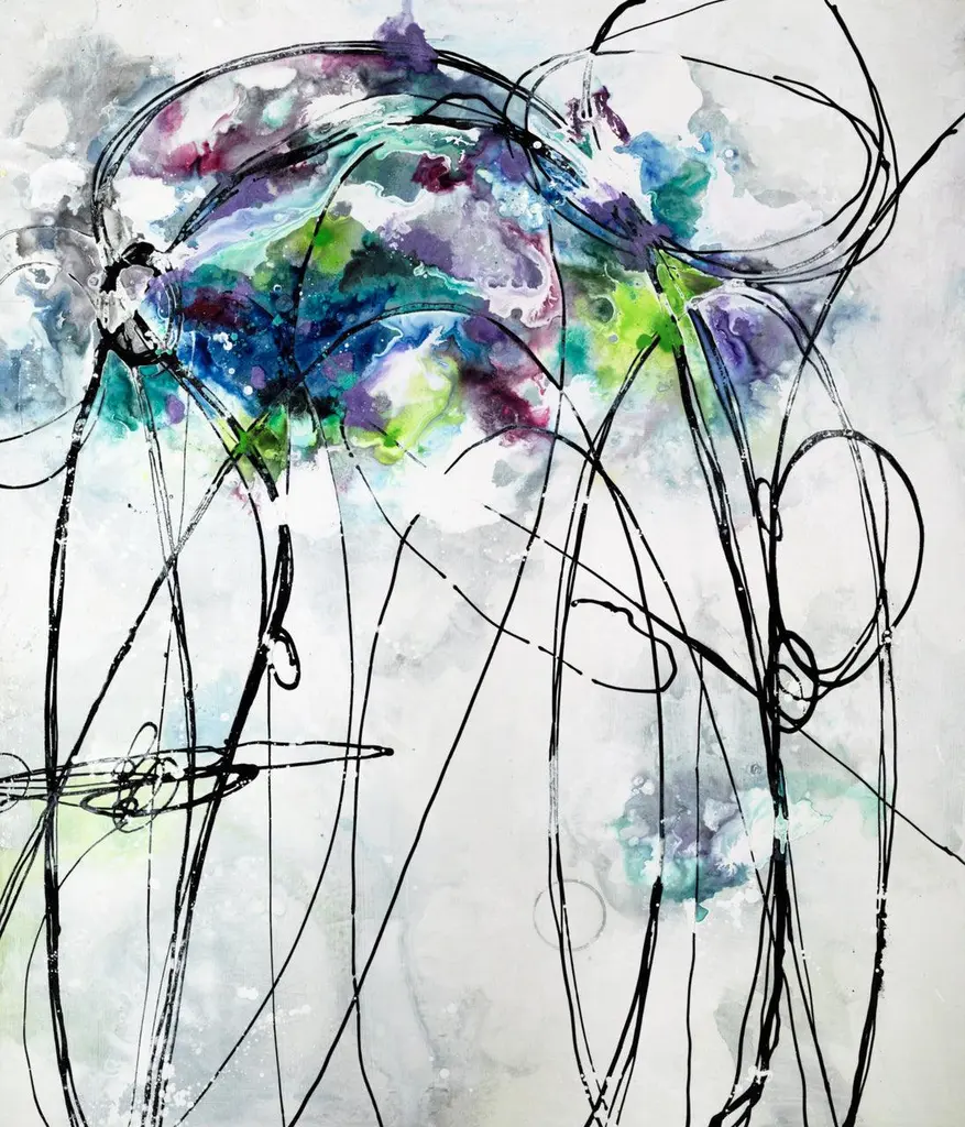 Digital composite artwork created by layering watercolor splatters to illustrate the color of flowers and gestural line art to show the outlines of the petals.