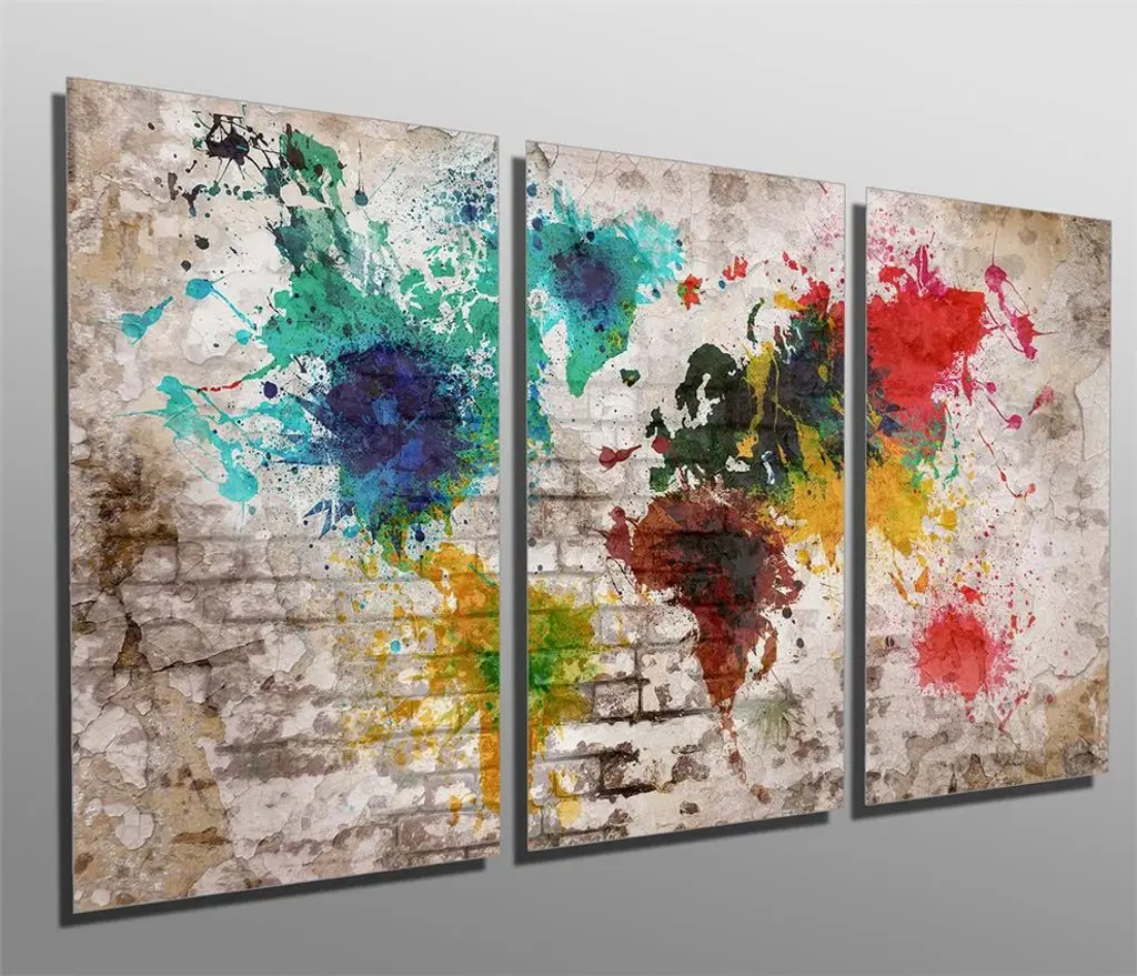 36"œ x 18"œ total size. Ready To Hang! (3 pieces - 12"œ x 18"œ each). 3 Panel Split (Triptych) Abstract art World Map Metal Print. Blue color tone brick wall and splash of many colors. Modern metal wall art for home or office wall decor & interior design. Printed on Luxurious, HD aluminum glossy metal panels. Multi Panel ar. HD aluminum panels. Metal print wall art. Includes Shadow Wall Mount on the back.• Aluminum Metal Wall Art• Made in USA• Ready to hang - No assembly required• Shadow mount hardware on the back• 0.045"œ thick HD Aluminum Panels• Scratch resistant, glossy finish• Superb color clarity, luxurious prints• Epson printing process• For indoor or moisture rich environment use• Easy to clean. Gently wipe with microfiber cloth.