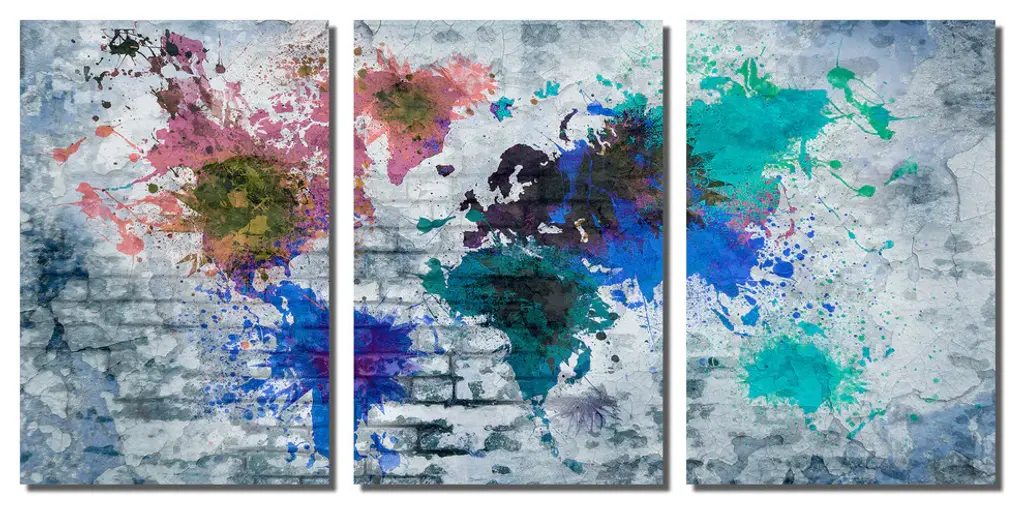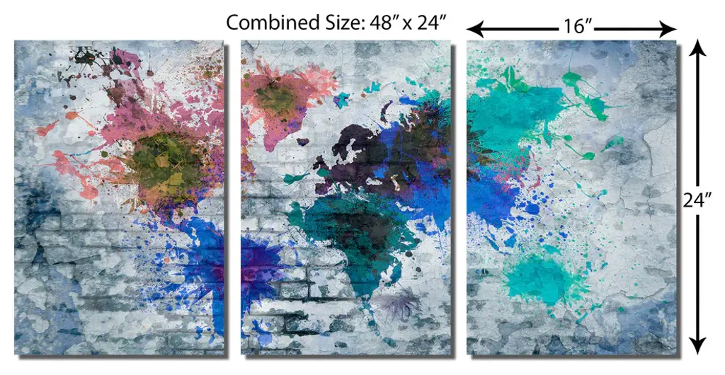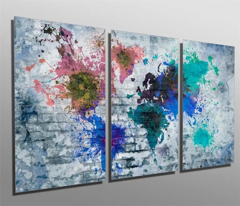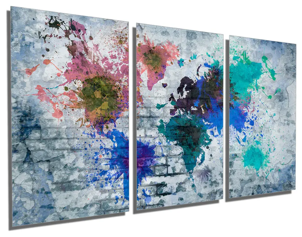48"œ x 24"œ total size. Ready To Hang! (3 pieces - 16"œ x 24"œ each). 3 Panel Split (Triptych) Abstract art World Map Metal Print. Blue color tone brick wall and splash of many colors. Modern metal wall art for home or office wall decor & interior design. Printed on Luxurious, HD aluminum glossy metal panels. Multi Panel ar. HD aluminum panels. Metal print wall art. Includes Shadow Wall Mount on the back.• Aluminum Metal Wall Art• Made in USA• Ready to hang - No assembly required• Shadow mount hardware on the back• 0.045"œ thick HD Aluminum Panels• Scratch resistant, glossy finish• Superb color clarity, luxurious prints• Epson printing process• For indoor or moisture rich environment use• Easy to clean. Gently wipe with microfiber cloth.