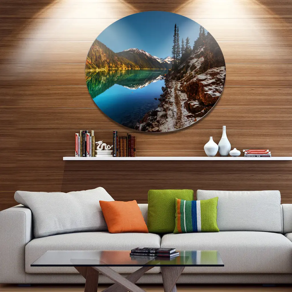 Bring Contemporary Abstraction to your home with this large Circle Metal wall art. This Blue Clear Lake with Mountains Metal Artwork makes it the focal point of any room or office. - White Gloss Coating ensures colors are extra vibrant with light reflection.- Aluminum grade Sheet Metal with 1 inch mounting frame on the back giving the illusion that the artwork is floating on the wall..- Mounting Brackets are included along with instructions.- High Quality Digital images are created directly into a glossy aluminum panel producing a stunning and captivating print into the glossy finish of the metal.- Water, Fire and Scratch resistant HD Aluminum panels.- Looks better than any photo paper and guaranteed to last at least 20 years- Easy to clean with a microfiber cloth. Colors are far superior to regular Canvas Art. - Easy to Hang