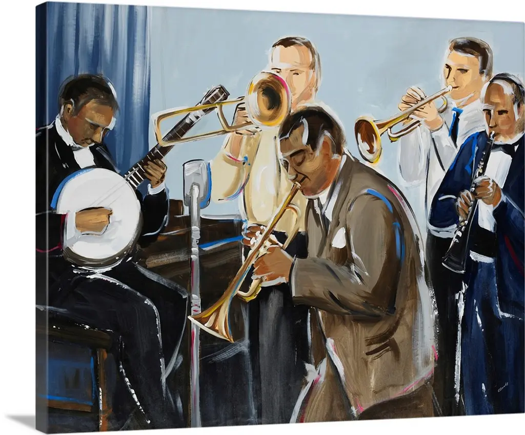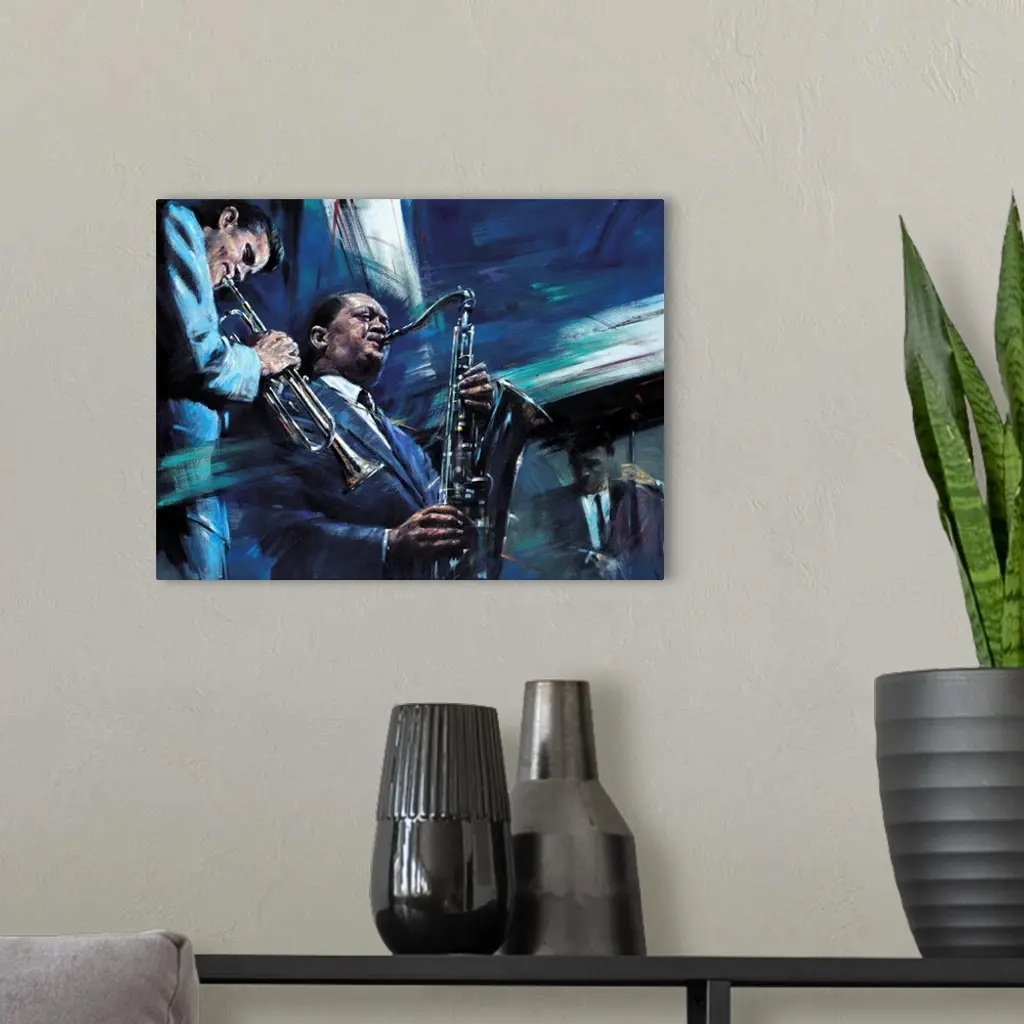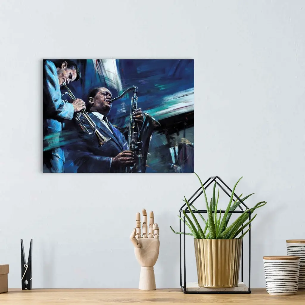 Contemporary painting of Jazz musicians playing the saxophone and trumpet with a bassist in the back.