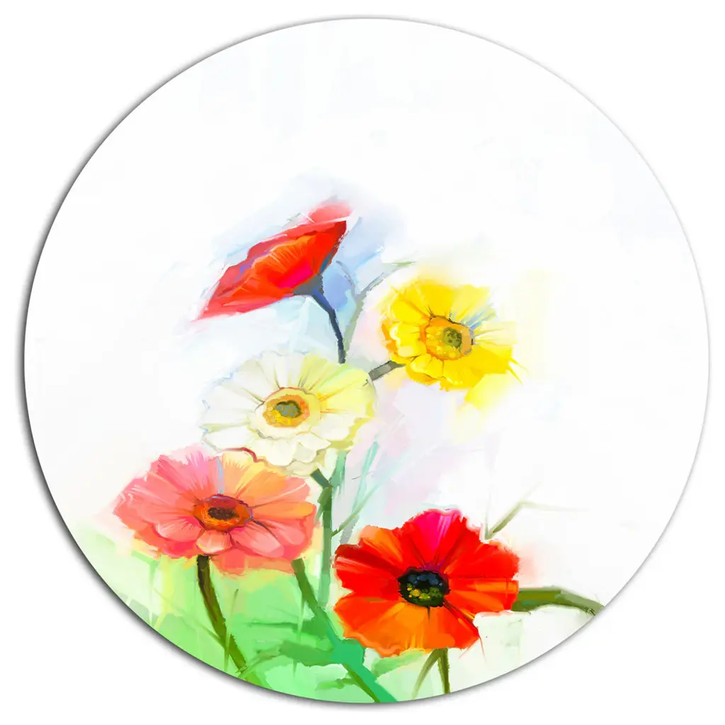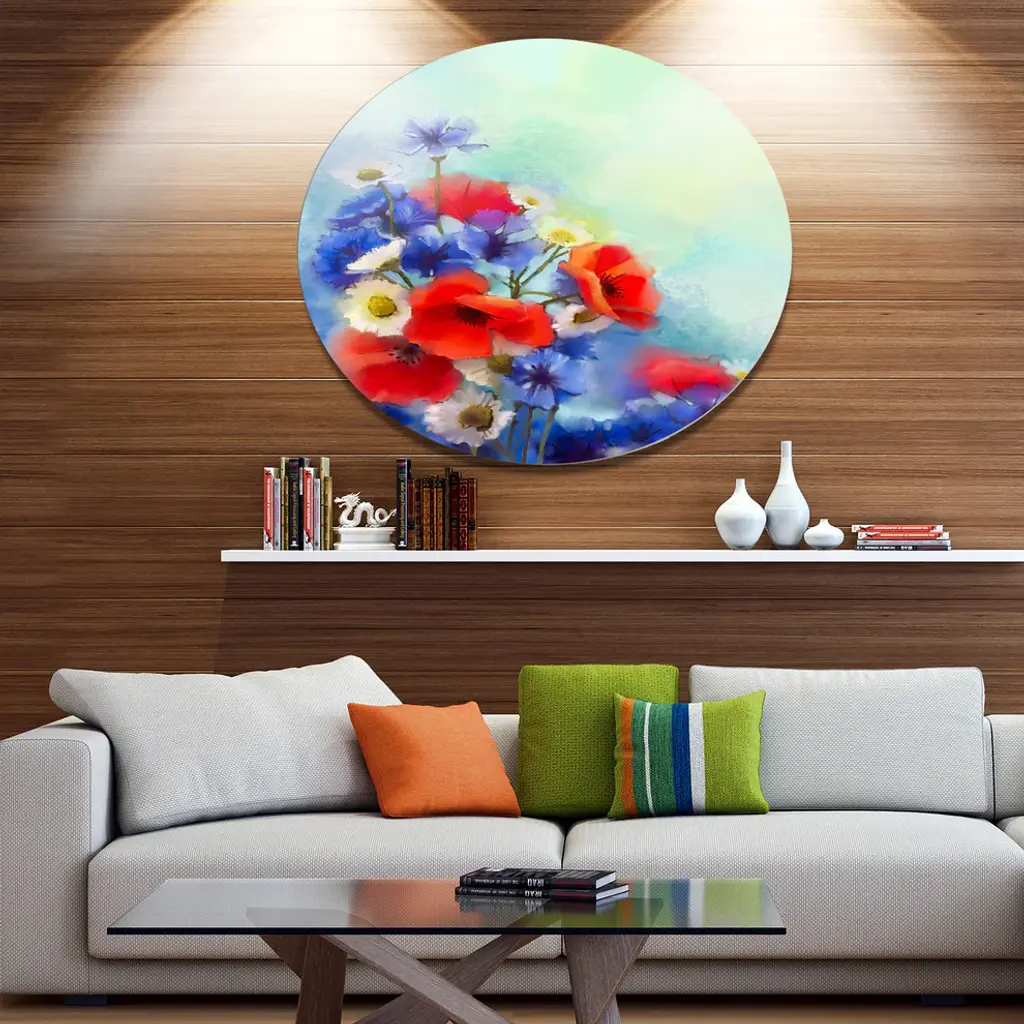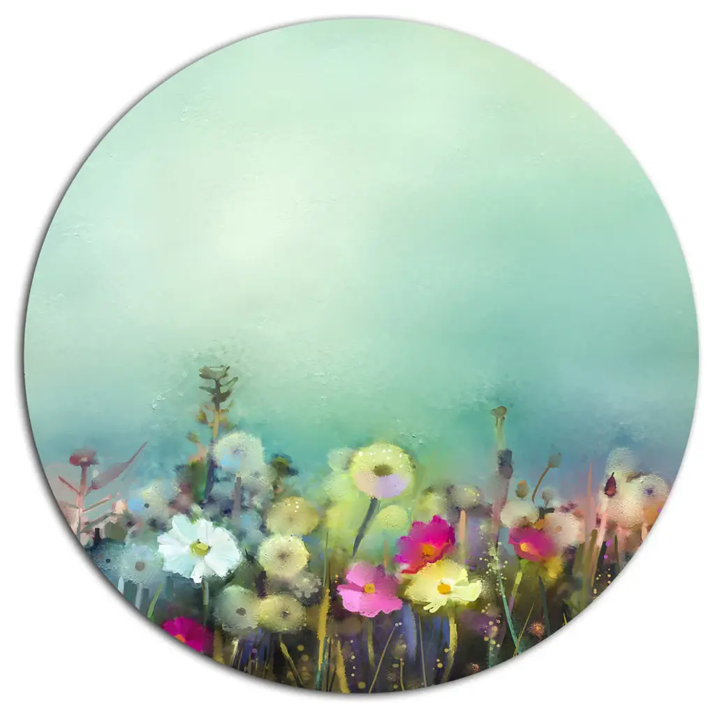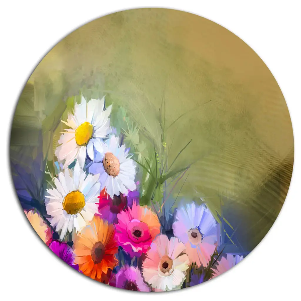 Bring Contemporary Abstraction to your home with this large Circle Metal wall art. This Blue Cornflower and White Daisy Metal Artwork makes it the focal point of any room or office. - White Gloss Coating ensures colors are extra vibrant with light reflection.- Aluminum grade Sheet Metal with 1 inch mounting frame on the back giving the illusion that the artwork is floating on the wall..- Mounting Brackets are included along with instructions.- High Quality Digital images are created directly into a glossy aluminum panel producing a stunning and captivating print into the glossy finish of the metal.- Water, Fire and Scratch resistant HD Aluminum panels.- Looks better than any photo paper and guaranteed to last at least 20 years- Easy to clean with a microfiber cloth. Colors are far superior to regular Canvas Art. - Easy to Hang