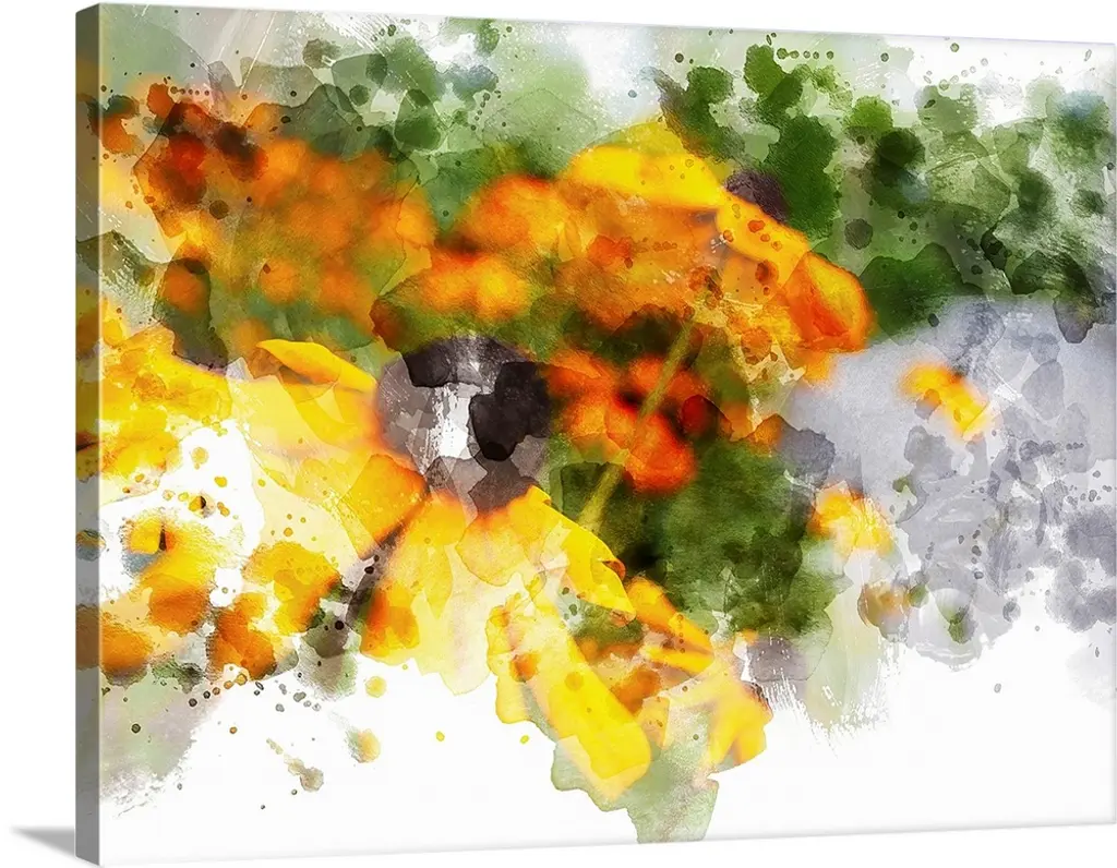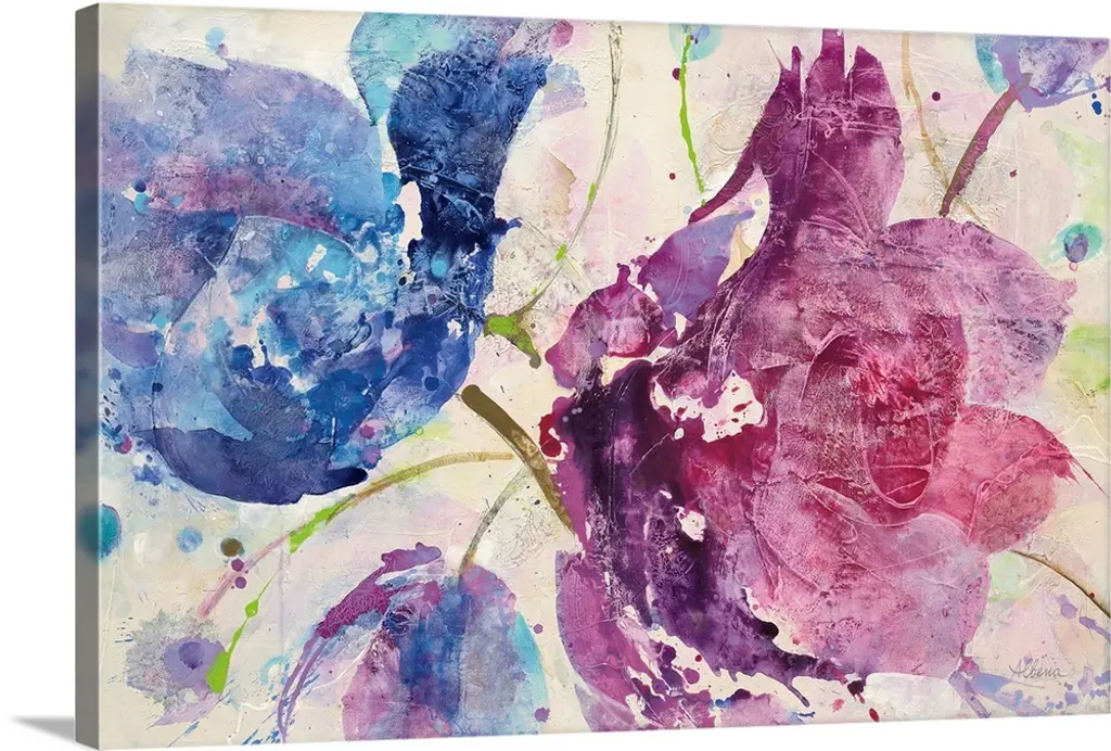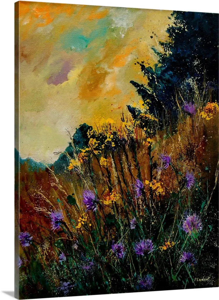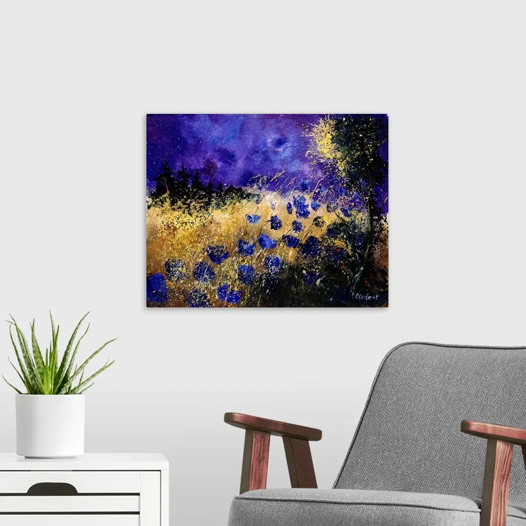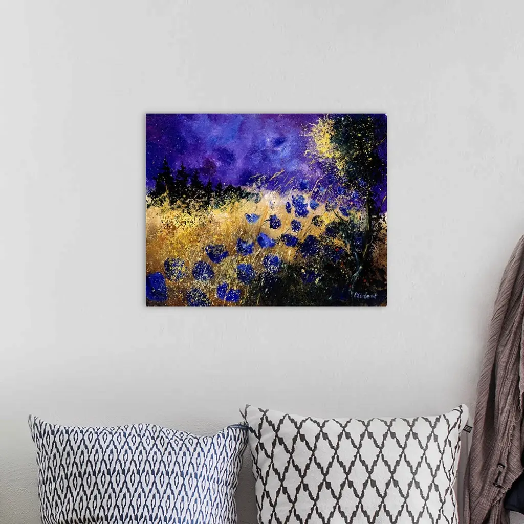 Contemporary painting of a field of blue cornflowers along a tree with a vibrant purple sky.