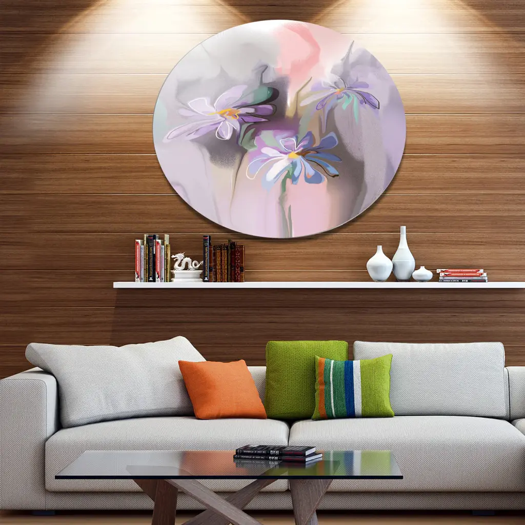 Bring Contemporary Abstraction to your home with this large Circle Metal wall art. This Blue Daisies Watercolor Metal Artwork makes it the focal point of any room or office. - White Gloss Coating ensures colors are extra vibrant with light reflection.- Aluminum grade Sheet Metal with 1 inch mounting frame on the back giving the illusion that the artwork is floating on the wall..- Mounting Brackets are included along with instructions.- High Quality Digital images are created directly into a glossy aluminum panel producing a stunning and captivating print into the glossy finish of the metal.- Water, Fire and Scratch resistant HD Aluminum panels.- Looks better than any photo paper and guaranteed to last at least 20 years- Easy to clean with a microfiber cloth. Colors are far superior to regular Canvas Art. - Easy to Hang