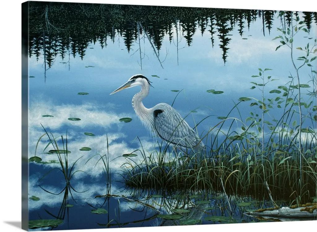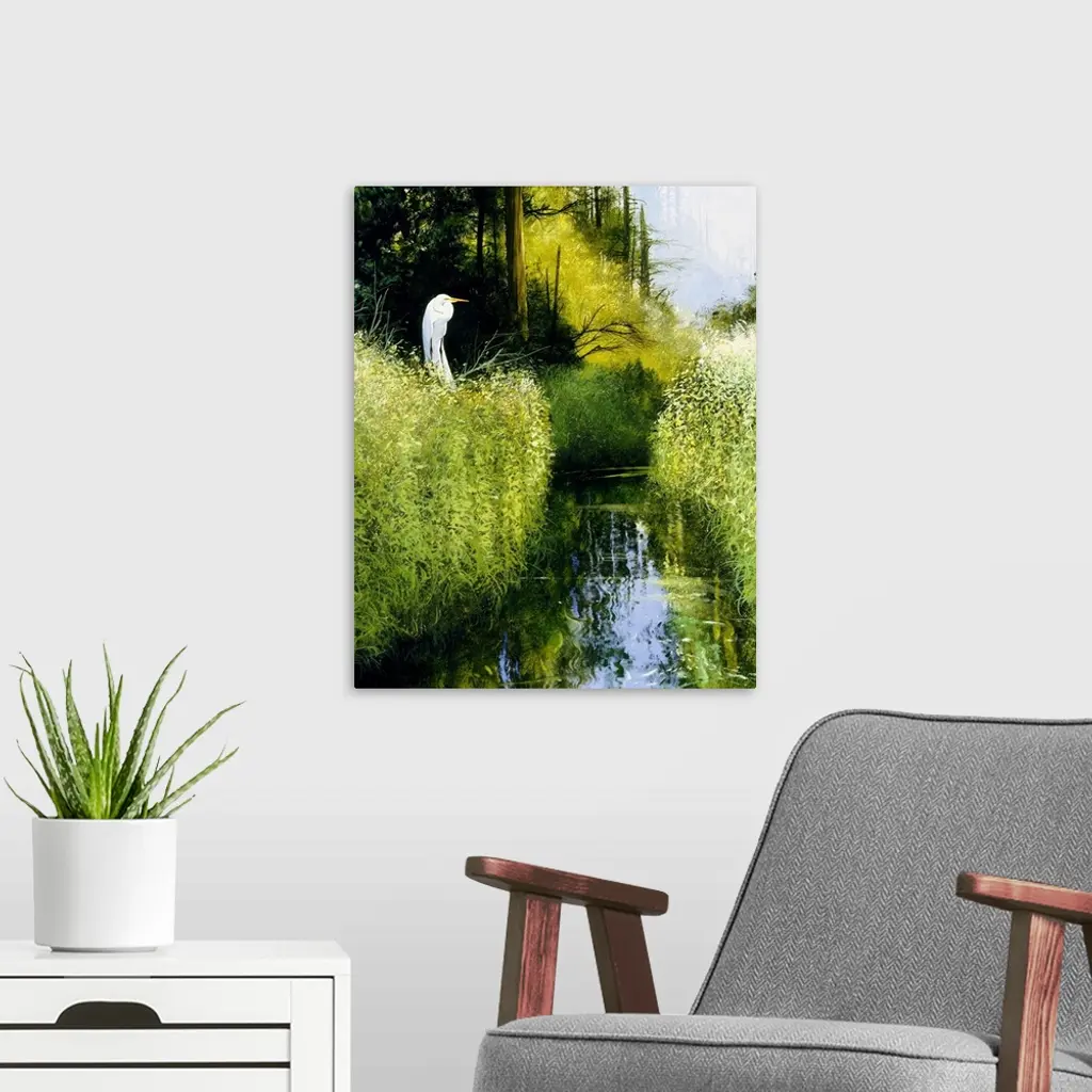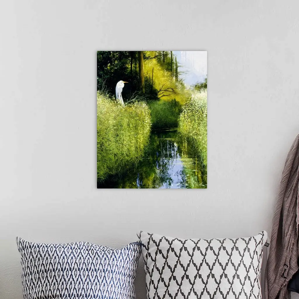 Contemporary painting of an egret perched on a branch above a river flowing through a wetland.