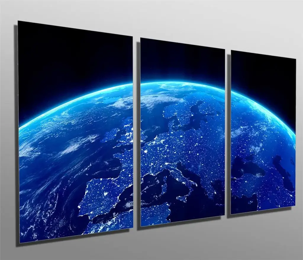 72"œ x 36"œ total size. Ready To Hang! (3 pieces - 24"œ x 36"œ each). 3 Panel Split (Triptych) Metal Print ft. Blue Earth From Space, at night. Modern metal wall art for home or office wall decor & interior design. Printed on Luxurious, HD aluminum glossy metal panels. Multi panel art.. HD aluminum panels. Metal print wall art. Includes Shadow Wall Mount on the back.• Aluminum Metal Wall Art• Made in USA• Ready to hang - No assembly required• Shadow mount hardware on the back• 0.045"œ thick HD Aluminum Panels• Scratch resistant, glossy finish• Superb color clarity, luxurious prints• Epson printing process• For indoor or moisture rich environment use• Easy to clean. Gently wipe with microfiber cloth.