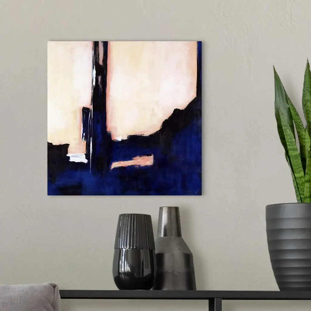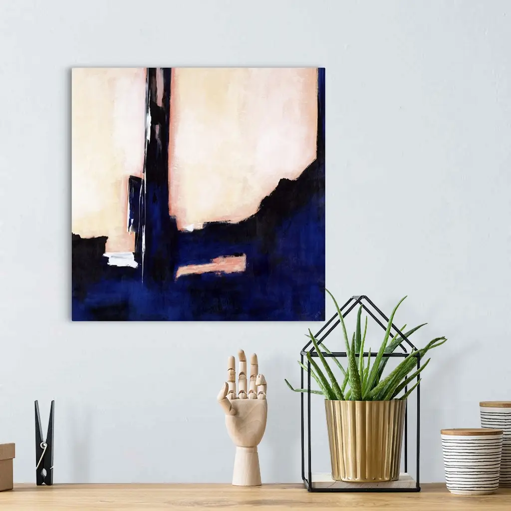 Abstract painting with a deep, thick blue and black design taking up most of the canvas on a subtle pink and yellow background.