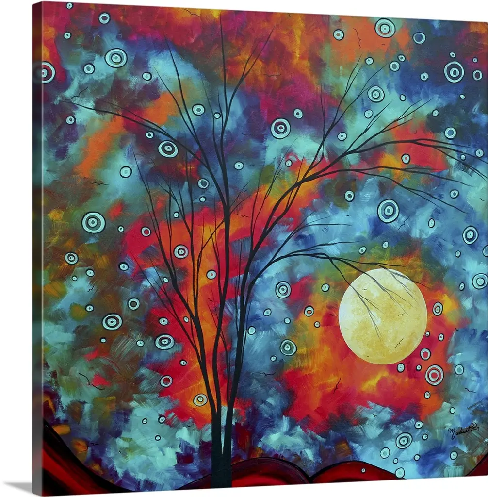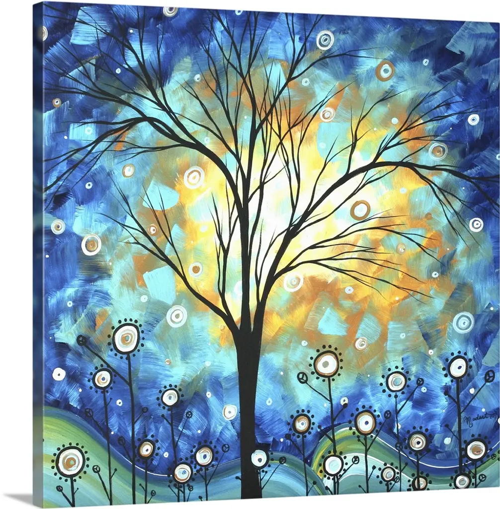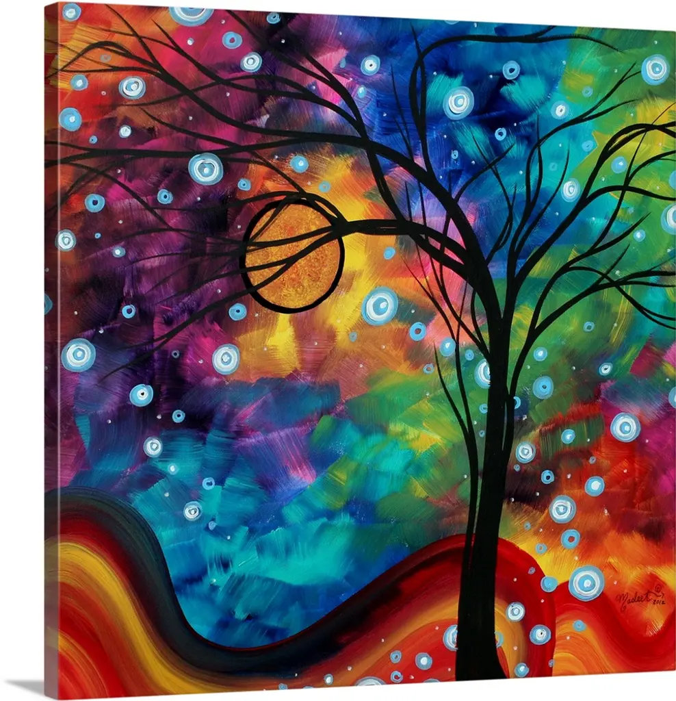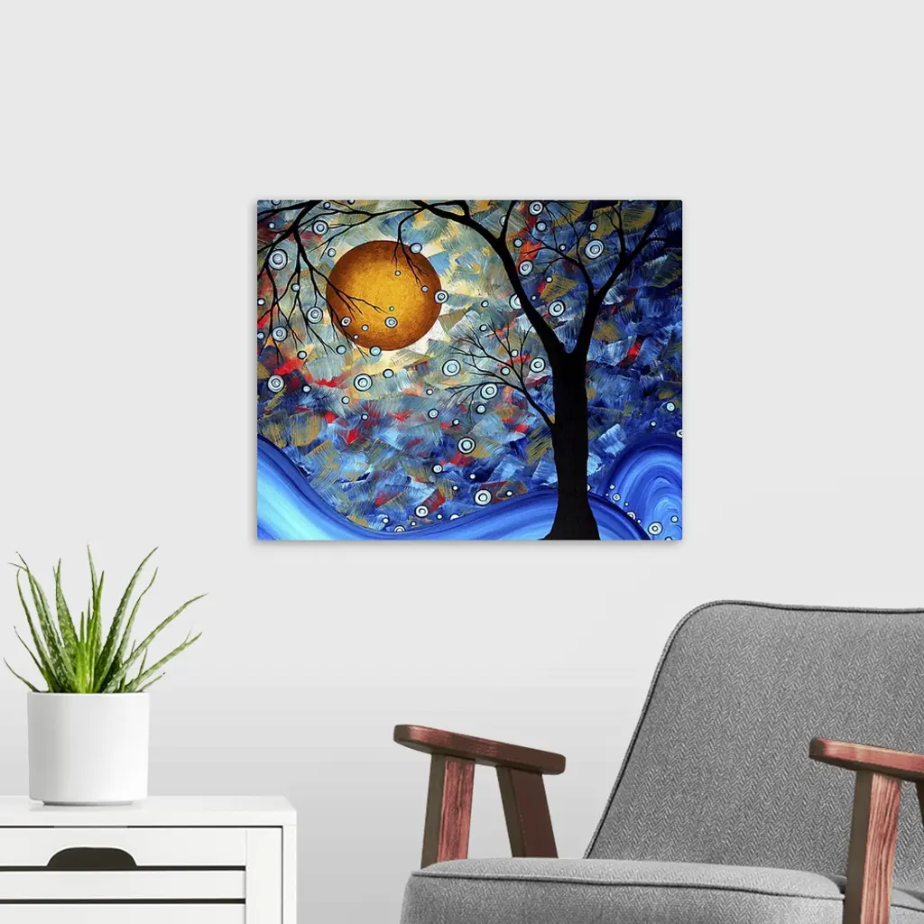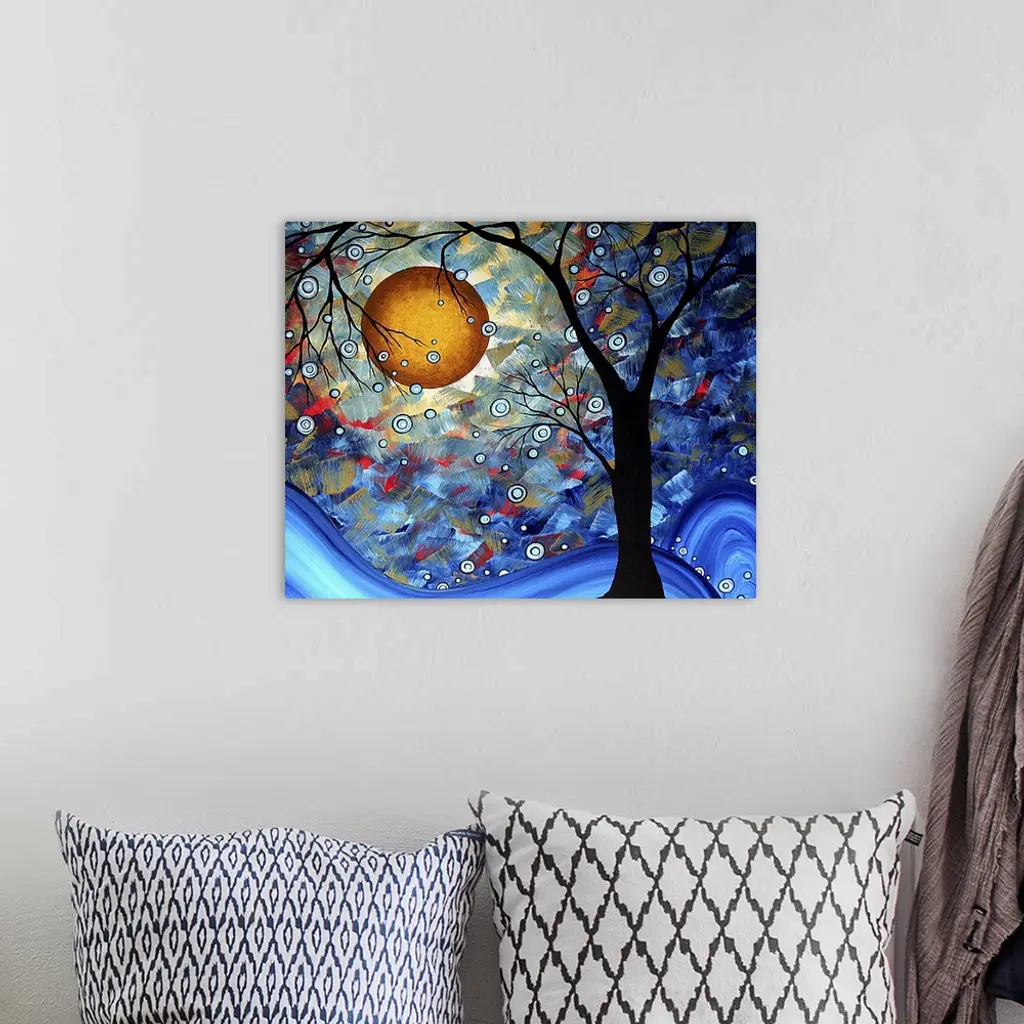 Abstract artwork perfect for the home or office of a silhouetted tree that has small blue circles on its branches and a wave of blue at the bottom. The sun is behind it and various colors of brushstrokes are applied surrounding the tree.