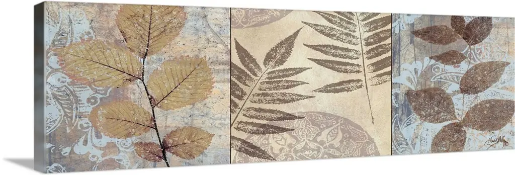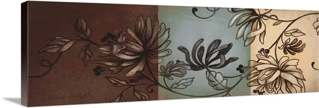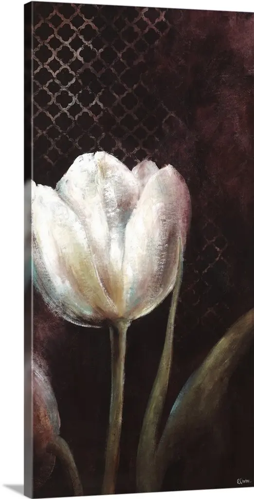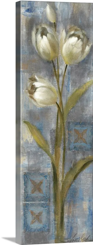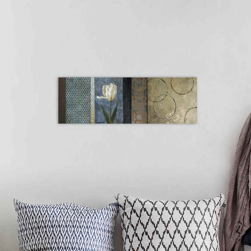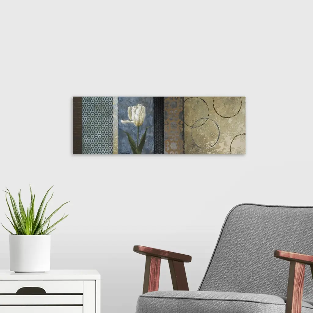 Long panoramic art piece with a white tulip being the focal point surrounded by different colors and shape stripes.