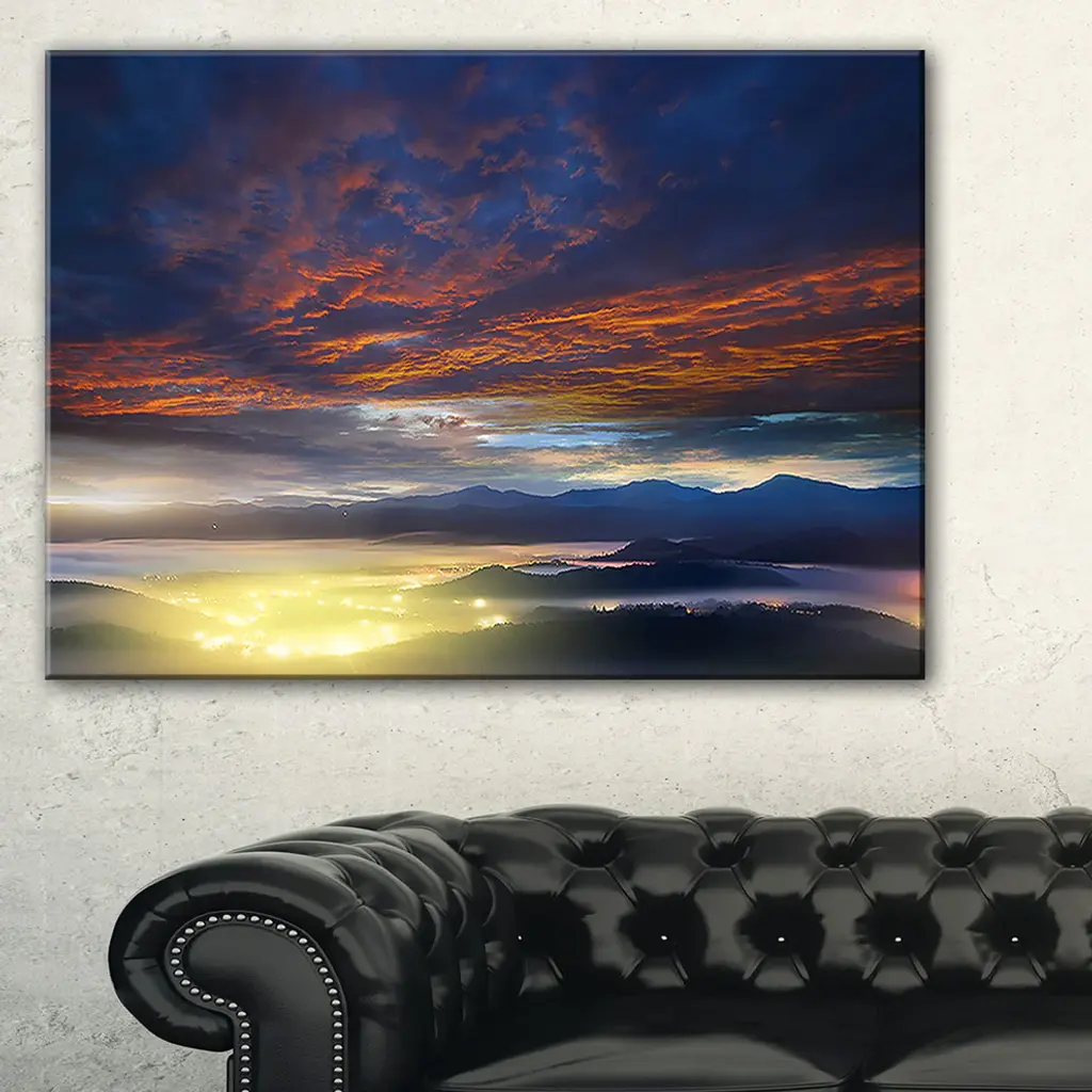 The Blue Fiery Overcast at Sunrise canvas art print is sure to make an impression on anyone who sees it. This artwork is gallery wrapped around a 1-inch solid wood frame and arrives carefully packaged and entirely ready to hang on the wall. Design Art only uses the highest resolution and pigments to ensure a crisp colorful print that is never faded or pixelated. This artwork is sure to be a conversation starter in any home or office.