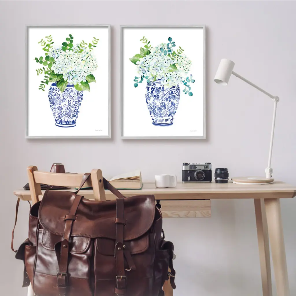 Blue Floral Bouquets Lush Green Botanicals Ornate Pot,2pc, Each 24 X 30