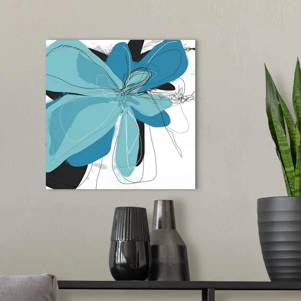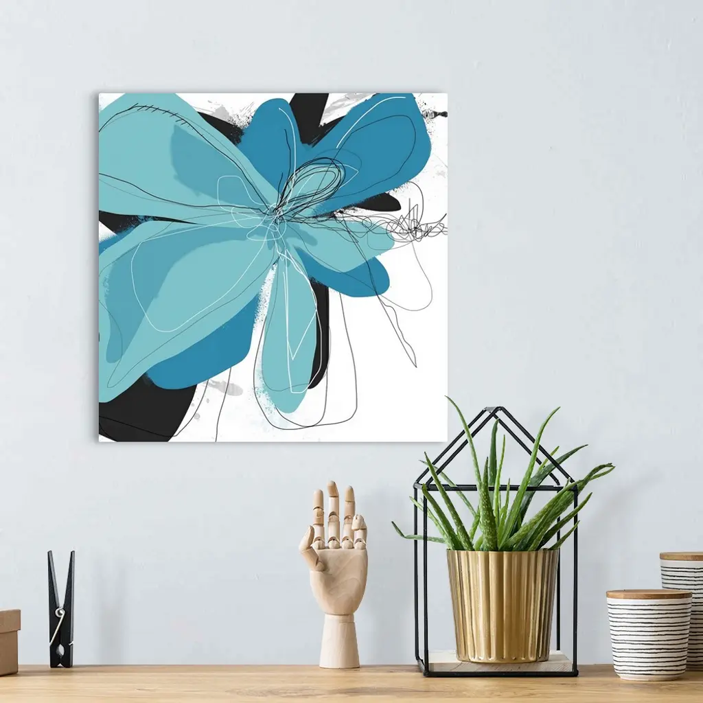 This abstract piece of artwork is of a blue floral with light illustration that is used throughout and the dark floral shape in the background allows for depth and dimension.