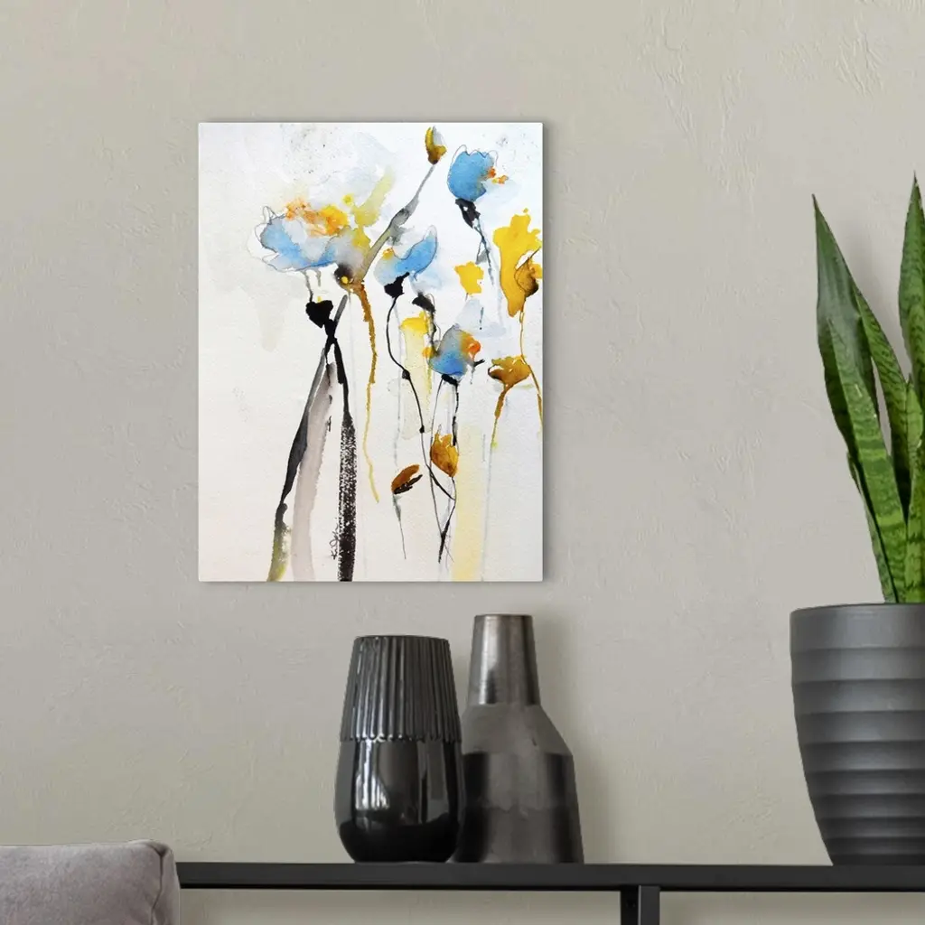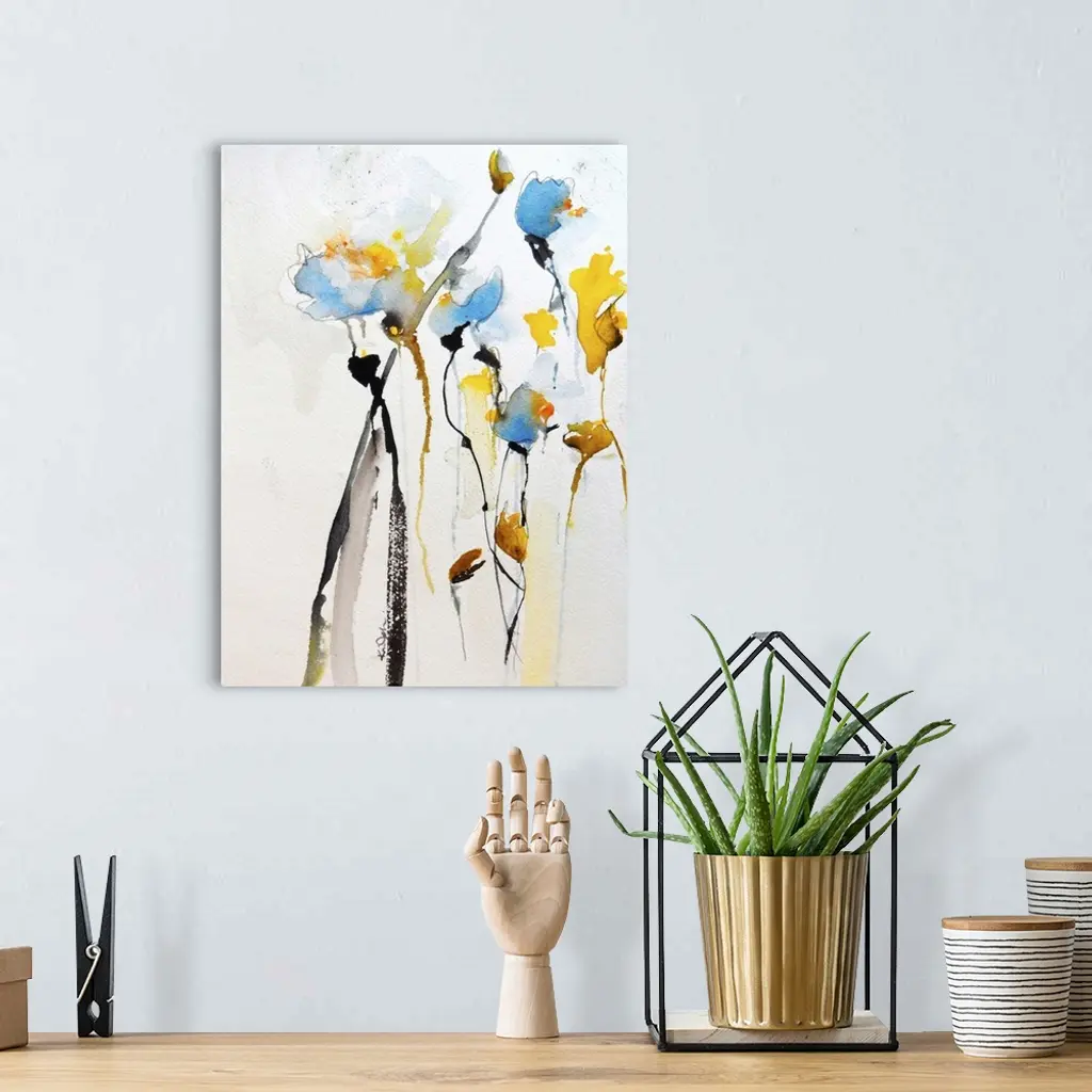 Contemporary watercolor painting of vibrant yellow and blue flowers.