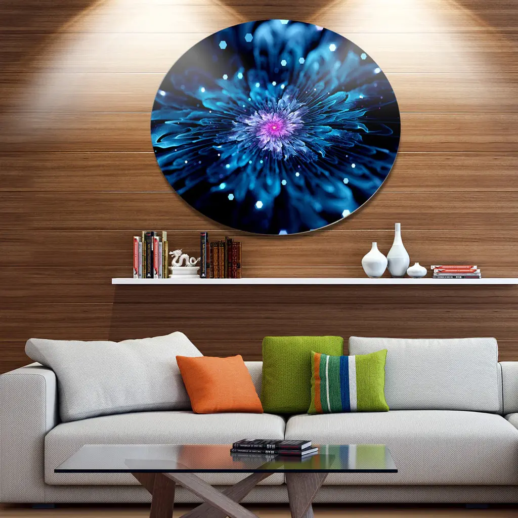 Bring Contemporary Abstraction to your home with this large Circle Metal wall art. This Blue Fractal Flower with Shiny Particles Metal Artwork makes it the focal point of any room or office. - White Gloss Coating ensures colors are extra vibrant with light reflection.- Aluminum grade Sheet Metal with 1 inch mounting frame on the back giving the illusion that the artwork is floating on the wall..- Mounting Brackets are included along with instructions.- High Quality Digital images are created directly into a glossy aluminum panel producing a stunning and captivating print into the glossy finish of the metal.- Water, Fire and Scratch resistant HD Aluminum panels.- Looks better than any photo paper and guaranteed to last at least 20 years- Easy to clean with a microfiber cloth. Colors are far superior to regular Canvas Art. - Easy to Hang