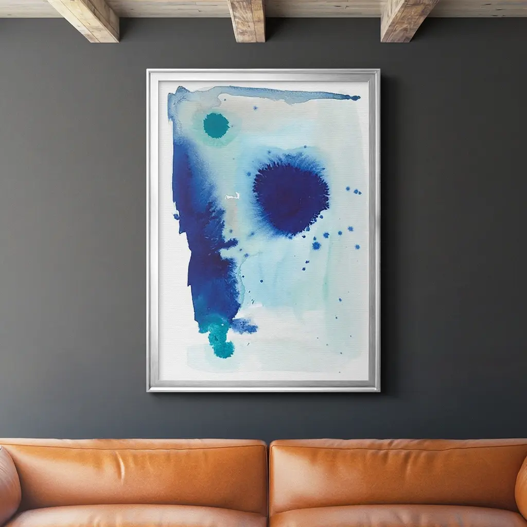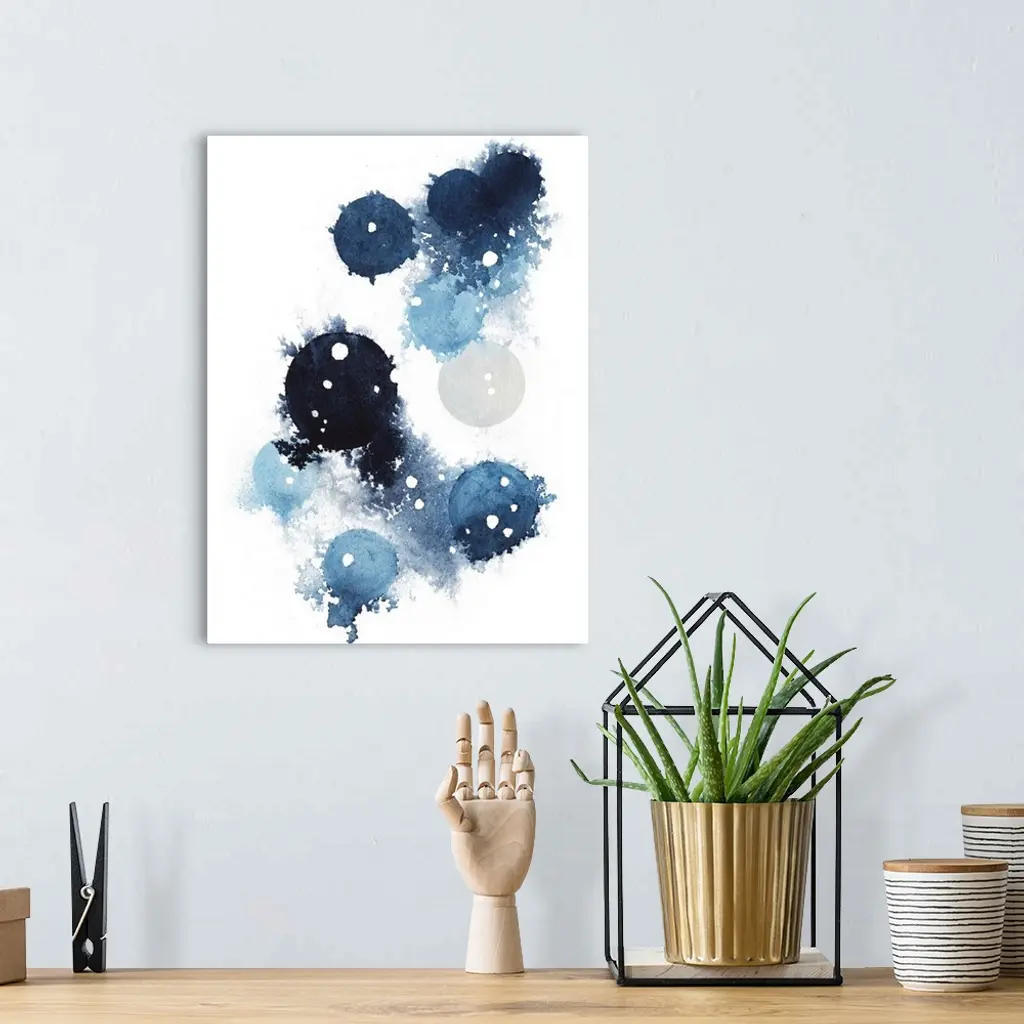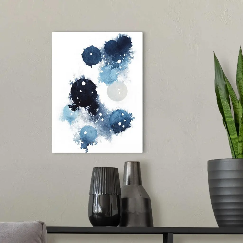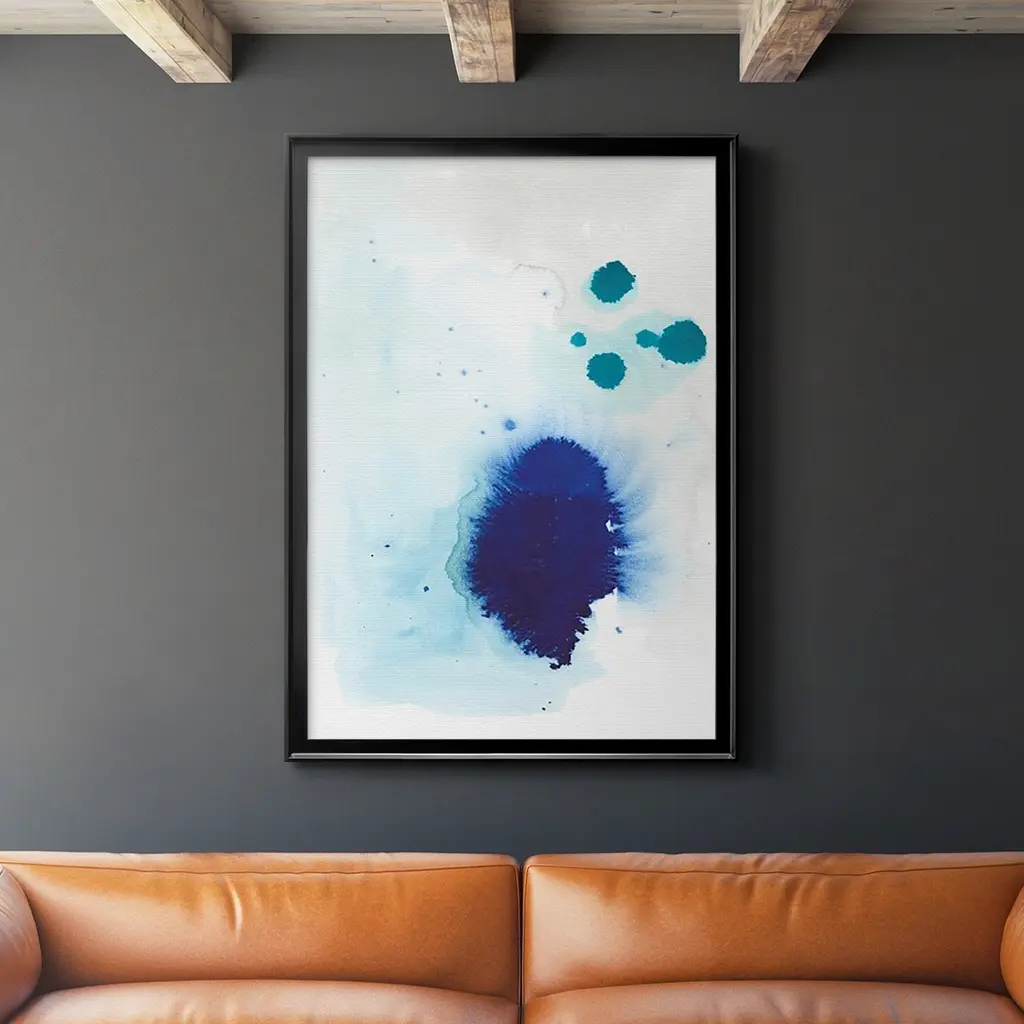 Contemporary abstract artwork of blue globular shapes with bleed stretching out into empty space.